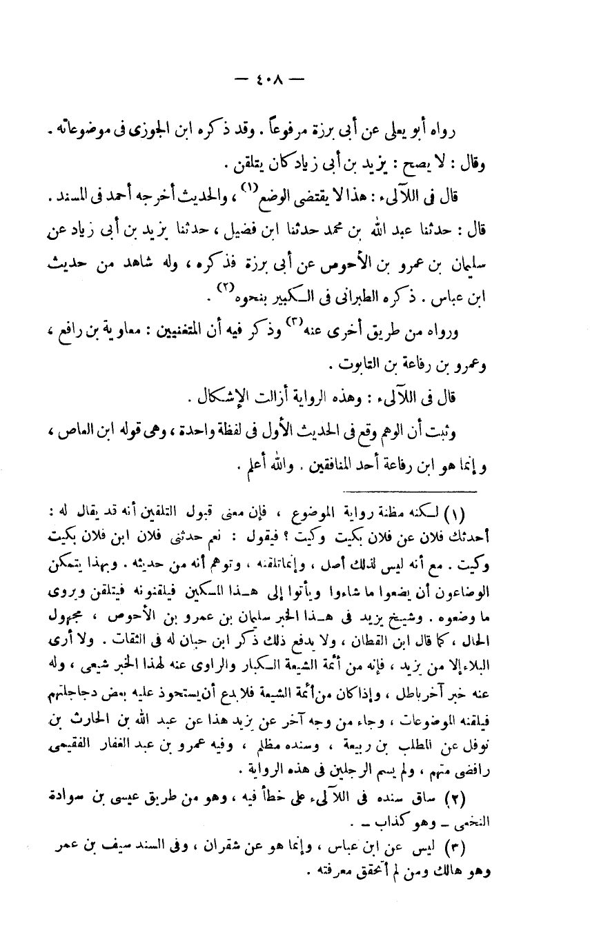 (1) لكنه مظنة رواية الموضوع، فإن معنى قبول التلقين أنه قد يقال له: أحدثك فلان عن فلان بكيت وكيت؟ فيقول: نعم حدثني فلان ابن فلان بكيت وكيت. مع أنه ليس لذلك أصل، وإنما تلقنه، وتوهم أنه من حديثه. وبهذا يتمكن الوضاعون أن يضعوا ما شاءوا ويأتوا إلى هذا المسكين فيلقنونه فيتلقن ويروي ما وضعوه. وشيخ يزيد في هذا الخبر سليمان بن عمرو بن الأحوص، مجهول الحال، كما قال ابن القطان، ولا يدفع ذلك ابن حبان له في الثقات. ولا أرى البلاء إلا من يزيد، فإنه من أئمة الشيعة الكبار والراوي عنه لهذا الخبر شيعي، وله عنه خبر آخر باطل، وإذا كان من أئمة الشيعة فلا بدع أن يستحوذ عليه بعض دجاجلتهم فيلقنه الموضوعات، وجاء من وحه آخر عن يزيد هذا عن عبد الله بن الحارث بن نوفل عن المطلب بن ربيعة، وسنده مظلم، وفيه عمرو بن عبد الغفار الفقيمي رافضي متهم، ولم يسم الرجلين في هذه الرواية.
