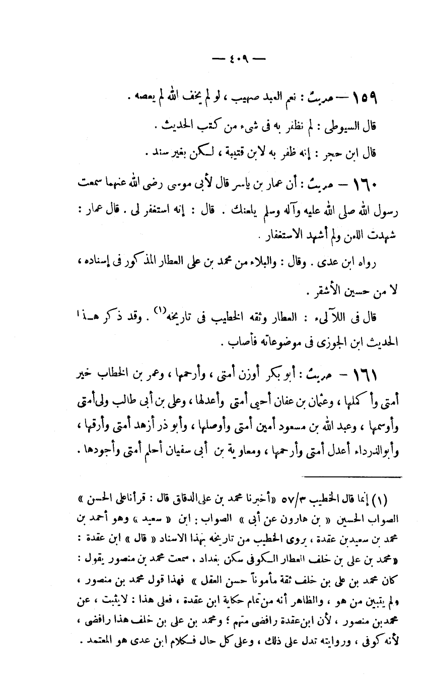 (1) إنما قال الخطيب 3/57 (أخبرنا محمد بن علي الدقاق قال: قرأنا على الحسن) الصواب الحسين (بن هارون عن أبي) الصواب: ابن (سعيد) وهو أحمد بن محمد بن سعيد بن عقدة، يروي الخطيب من تاريخه بهذا الاسناد (قال) ابن عقدة: (محمد بن علي بن خلف العطار الكوفي سكن بغداد، سمعت محمد بن منصور يقول: كان محمد بن علي بن خلف ثقة مأموناً حسن العقل) فهذا قول محمد بن منصور، لم يتبين من هو، والظاهر أنه من تمام حكاية ابن عقدة، فعلى هذا: لا يثبت، عن محمد بن منصور، لأن ابن عقدة رافضي متهم؛ ومحمد بن علي بن خلف هذا رافضي، لأنه كوفي، وروايته تدل على ذلك، وعلى كل حال فكلام ابن عدي هو المعتمد