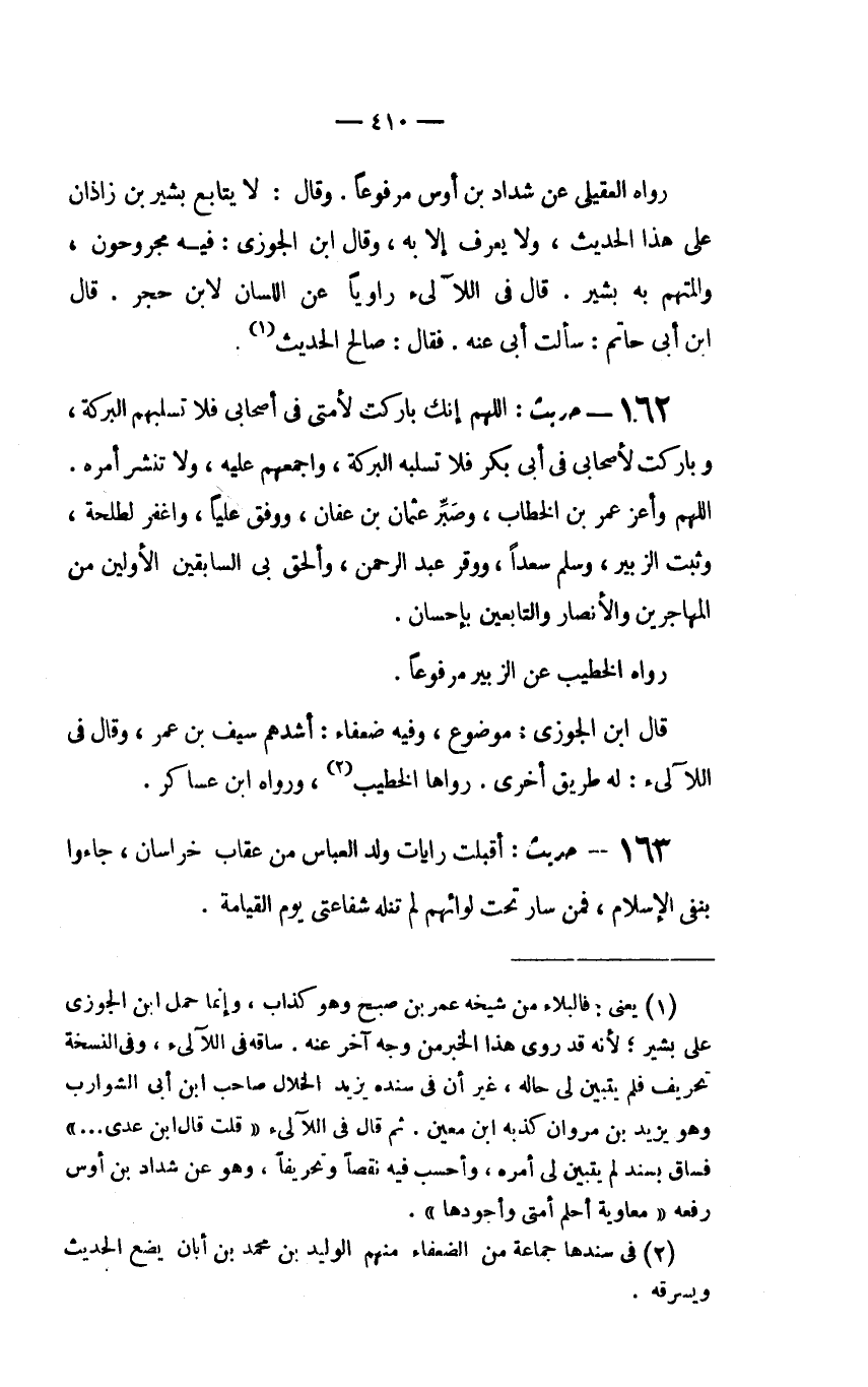 (1) يعني: فالبلاء من شيخه عمر بن صبح وهو كذاب، وإنما حمل ابن الجوزي على بشير؛ لأنه قد روى هذا الخبر من وجه آخر عنه. ساقه في اللآلىء، وفي النسخة تحريف فلم يتبين لي حاله، غير أن في سنده يزيد الخلال صاحب ابن أبي الشوارب وهو يزيد بن مروان كذبه ابن معين. ثم قال في اللآلىء (قلت قال ابن عدي........) فساق بسند لم يتبين لي أمره، وأحسب فيه نقصاً وتحريفاً، وهو عن شداد بن أوس رفعه (معاوية أحلم أمتى وأجودها) .