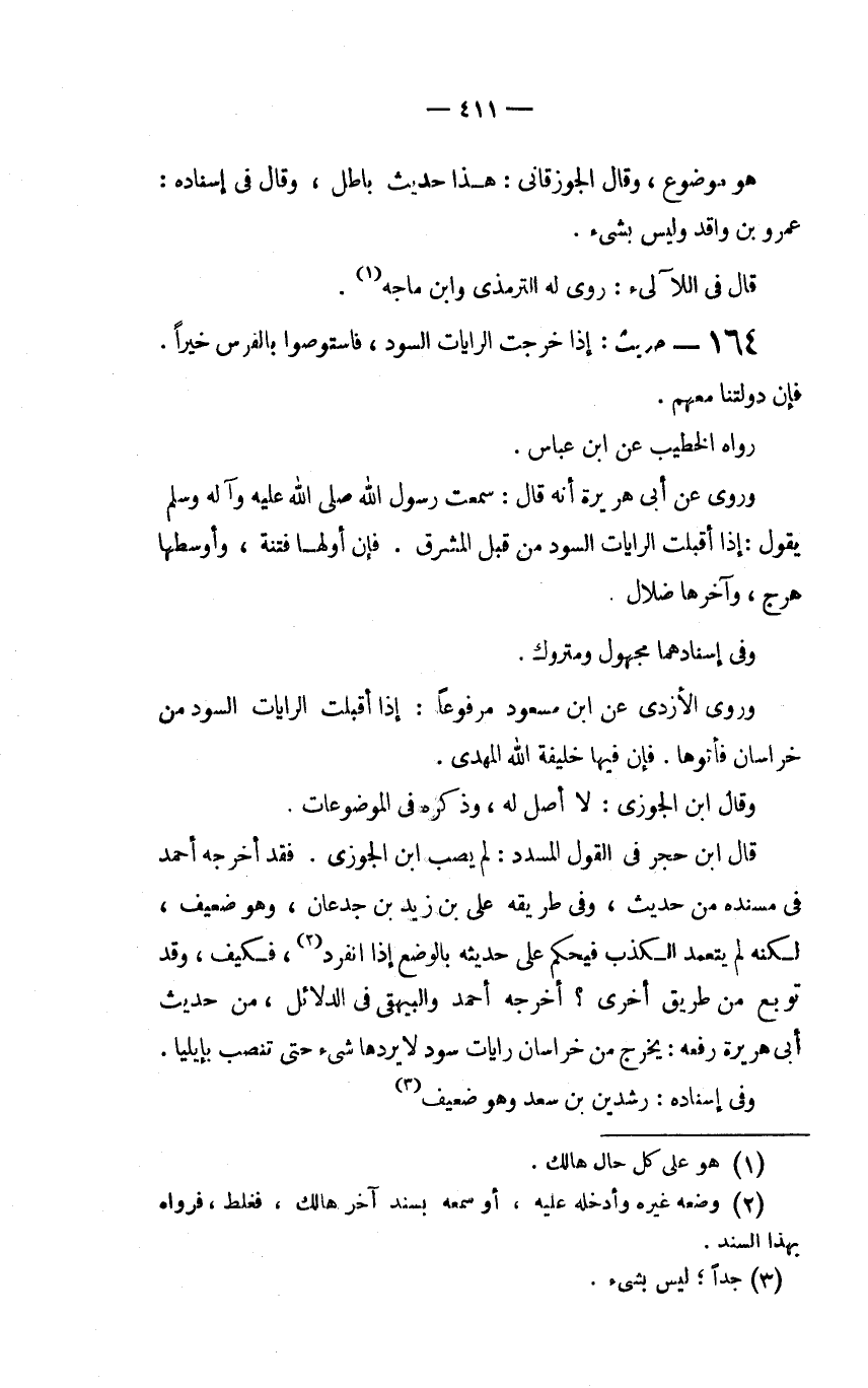 قال ابن حجر في القول المسدد: لم يصب ابن الجوزي. فقد أخرجه أحمد في مسنده من حديث، وفي طريقه على بن زيد بن جدعان، وهو ضعيف، لكنه لم يتعمد الكذب فيحكم على حديثه بالوضع إذا انفرد (2) ، فكيف، وقد توبع من طريق أخرى؟ أخرجه أحمد والبيهقي في الدلائل، من حديث أبي هريرة رفعه: يخرج من خراسان رايات سود لا يردها شيء حتى تنصب بإيليل.