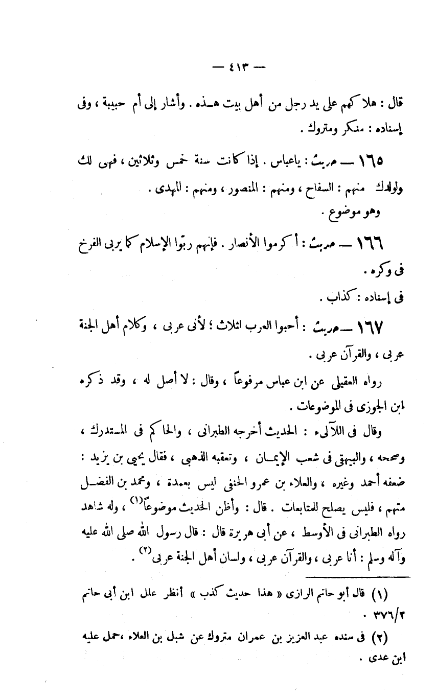وقال في اللآلىء: الْحَدِيثُ أَخْرَجَهُ الطَّبَرَانِيُّ، وُالْحَاكِمُ فِي الْمُسْتَدْرَكِ، وَصَحَّحَهُ، وَالْبَيْهَقِيُّ فِي شُعَبِ الْإِيمَانِ، وَتَعَقَّبَهُ الذَّهَبِيُّ، فَقَالَ يَحْيَى ين يَزِيدَ: ضَعَّفَهُ أَحْمَدُ وَغَيْرُهُ، وَالْعَلَاءُ بن عمروالحنفي لَيْسَ بِعُمْدَةٍ، وَمُحَمَّدُ بْنُ الْفَضْلِ متهم، فليس يصلح للمتابعات. قال: وَأَظُنُّ الْحَدِيثَ مَوْضُوعًا (1) ، وَلَهُ شَاهِدٌ رَوَاهُ الطَّبَرَانِيُّ فِي الأَوْسَطِ، عَنْ أَبِي هُرَيْرَةَ قَالَ: قَالَ رَسُولُ اللَّهِ صَلَّى اللَّهُ عَلَيْهِ وَآلِهِ وَسَلَّمَ: أَنَا عَرَبِيٌّ، وَالْقُرْآنُ عَرَبِيٌّ، ولسان أهل الجنة عربي (2) .