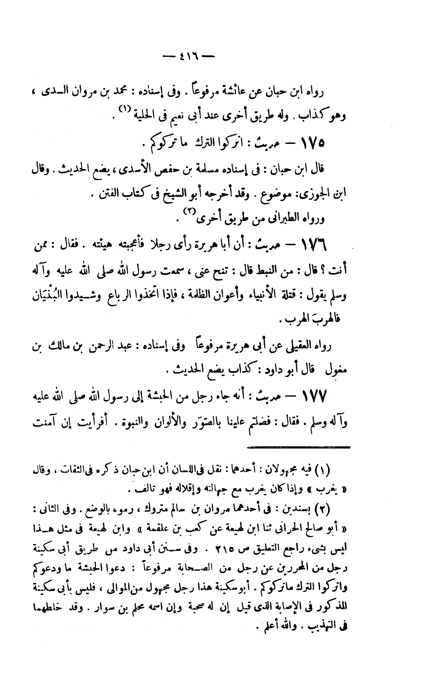 (2) بسندين: في أحدهما مروان بن سالم متروك، رموه بالوضع، وفي الثاني: (أبو صالح الحراني ثنا ابن لهيعة عن كعب بن علقمة) وابن لهيعة في مثل هذا ليس بشيء راجع التعليق ص 215. وفي سنن أبي داود من طريق أبي سكينة رجل من المحررين عن رجل من الصحابة مرفوعاً: دعوا الحبشة ما ودعوكم واتركوا الترك ما تركوكم. أبو سكينة هذا رجل مجهول من الموالي، فليس بأبي سكينة المذكور في الإصابة الذي قيل أن له صحبة وإن اسمه محلم بن سوار