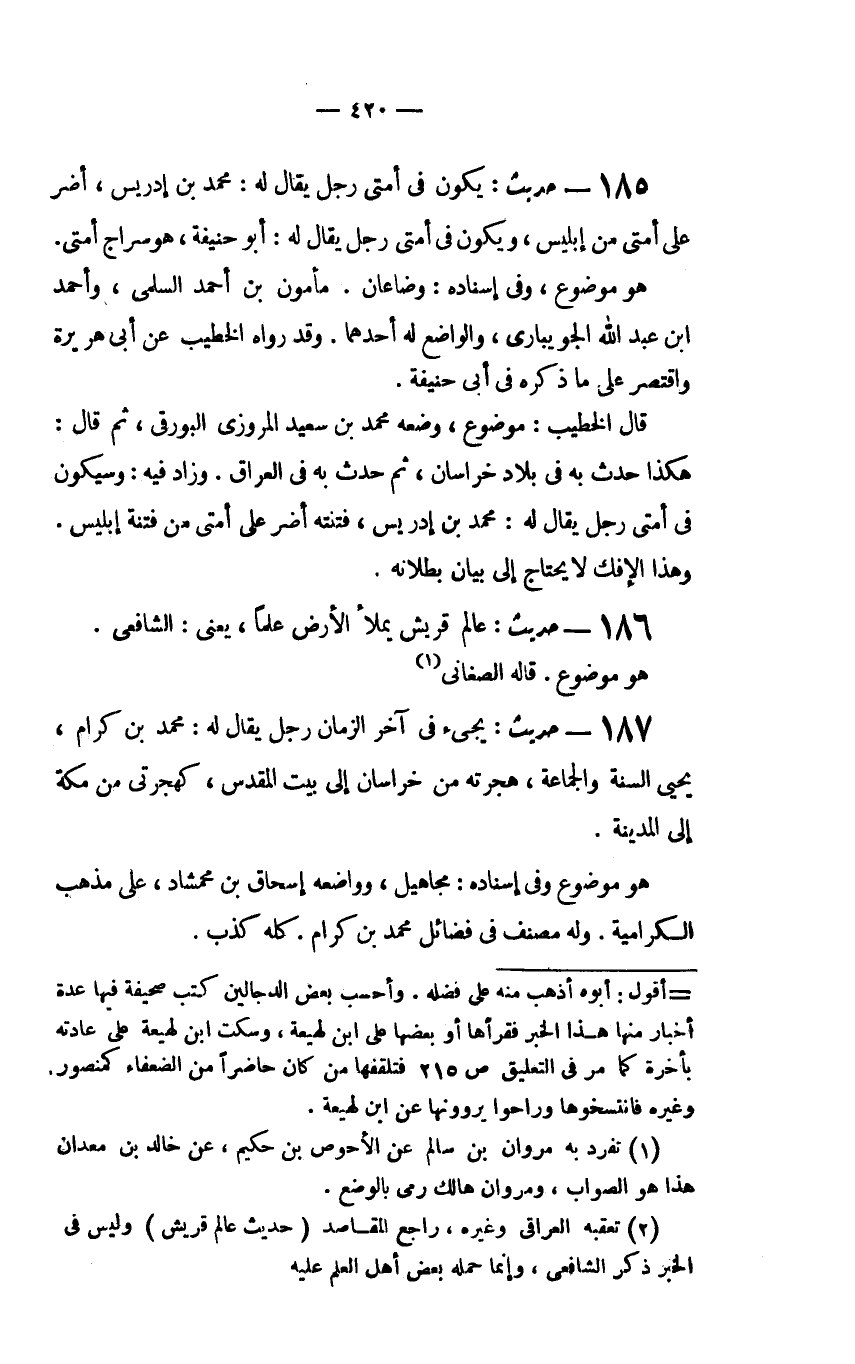 190 - حديث: "يَكُونُ فِي أُمَّتِي رَجُلٌ يُقَالُ لَهُ: مُحَمَّدُ بْنُ إِدْرِيسَ، أَضَرُّ عَلَى أُمَّتِي مِنْ إِبْلِيسَ، وَيَكُونُ فِي أُمَّتِي رَجُلٌ يُقَالُ لَهُ: أبو حنيفة، هو سراج أمتي.