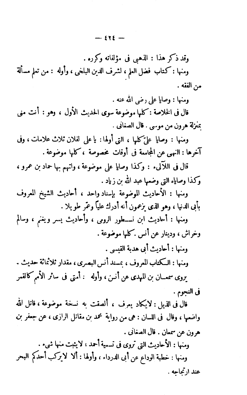 ومنها: وصايا علي كلها، التي أولها: يا علي لفلان ثلاث علامات، وفي آخرها: النهي عن المجامعة في أوقات مخصوصة، كلها موضوعة.