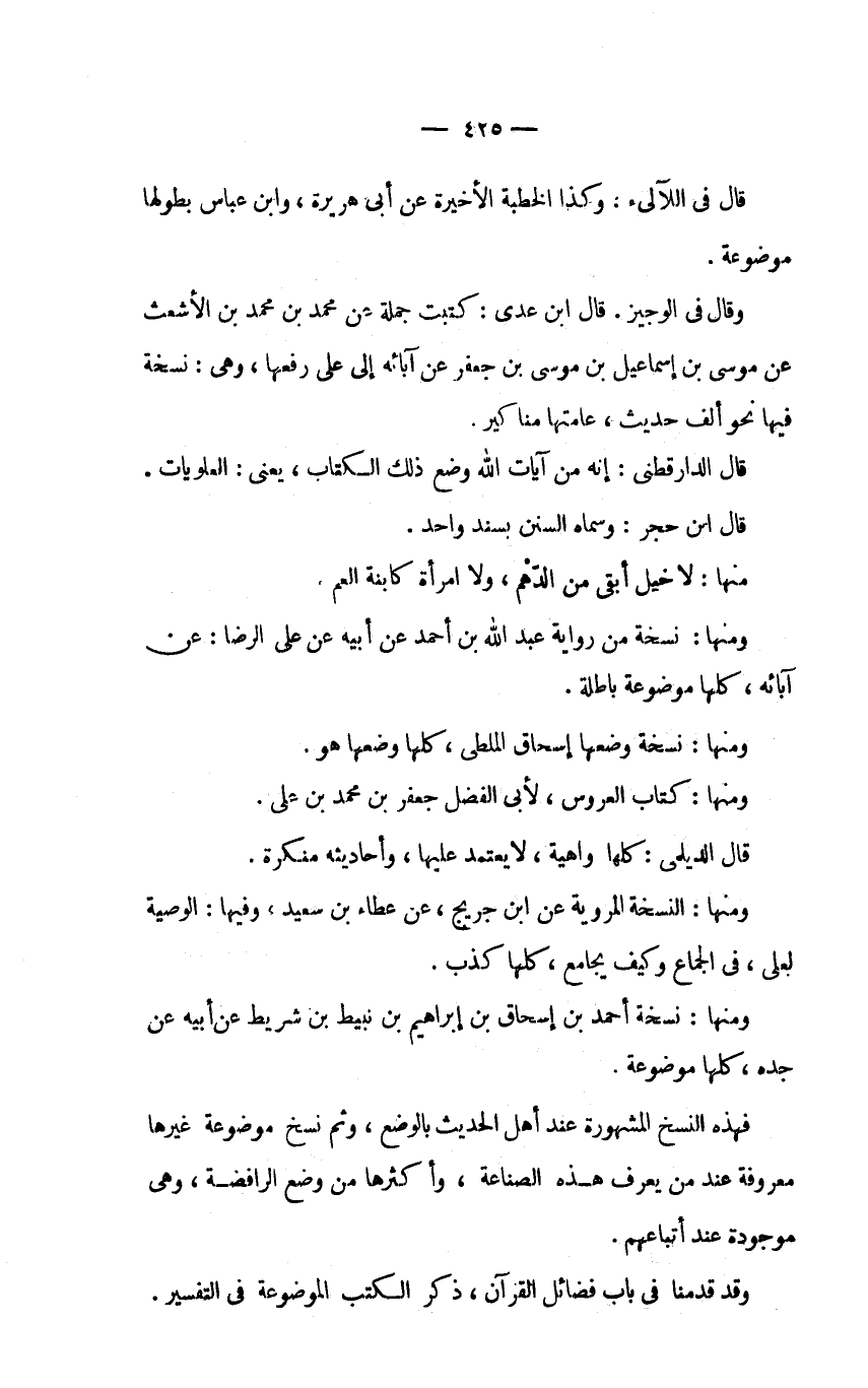 ومنها: نسخة من رواية عبد الله بن أحمد بن أبيه عن علي الرضا: عن آبائه، كلها موضوعة باطلة.