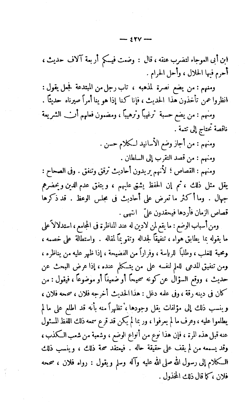 ومن أسباب الوضع: ما يقع لمن لا دين له عند المناظرة في المجامع، استدلالًا علي ما يقوله بما يطابق هواه، تنفيقًا لجداله وتقويمًا لمقاله. واستطالة على خصمه، ومحبة للغلب، وطلبًا للرياسة، وفرارًا من الفضيحة، إذا ظهر عليه من يناظره، ومن تنفيق المدعي للعم لنفسه على من يتكلم عنده، إذا عرض البحث عن حديث، ووقع السؤال عن كونه صحيحًا أو ضعيفاً أوموضوعاً، فيقول: من كان في دينه رقة، وفي علمه دغل: هذا الحديث أخرجه فلان، صححه فلان، وينسب ذلك إلى مؤلفات يقل وجودها، تظهرًا منه بأنه قد اطلع على ما لم يطلعوا عليه، وعرف ما لم يعرفوا، وربما لم يكن قد قرع سمعه ذلك اللفظ المسئول عنه قبل هذه المرة، فإن هذا نوع من أنواع الوضع، وشعبة من شعب الكذب، وقد يسمعه من لم يقف على حقيقة حاله. فيعتقد صحة ذلك، وينسب ذلك الكلام إلى رَسُولُ اللَّهِ صَلَّى اللَّهُ عَلَيْهِ وآله وسلم ويقول: رواه فلان، صححه فلان، كما قال ذلك المخذول.