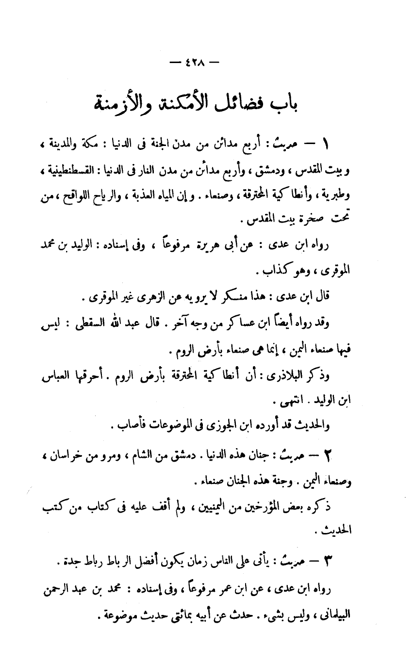 1 - حديث: "أربعة مَدَائِنَ مِنْ مُدُنِ الْجَنَّةِ فِي الدُّنْيَا: مَكَّةُ وَالْمَدِينَةُ، وَبَيْتُ الْمَقْدِسِ، وَدِمَشْقُ، وَأَرْبَعُ مَدَائِنَ مِنْ مُدُنِ النار في الدنيا: القسطنطينية، وطبرية، وأنطاكية المحترقة، وَصَنْعَاءُ. وَإِنَّ الْمِيَاهَ الْعَذْبَةَ، وَالرِّيَاحَ اللَّوَاقِحَ، مِنْ تَحْتِ صَخْرَةِ بَيْتِ الْمَقْدِسِ".