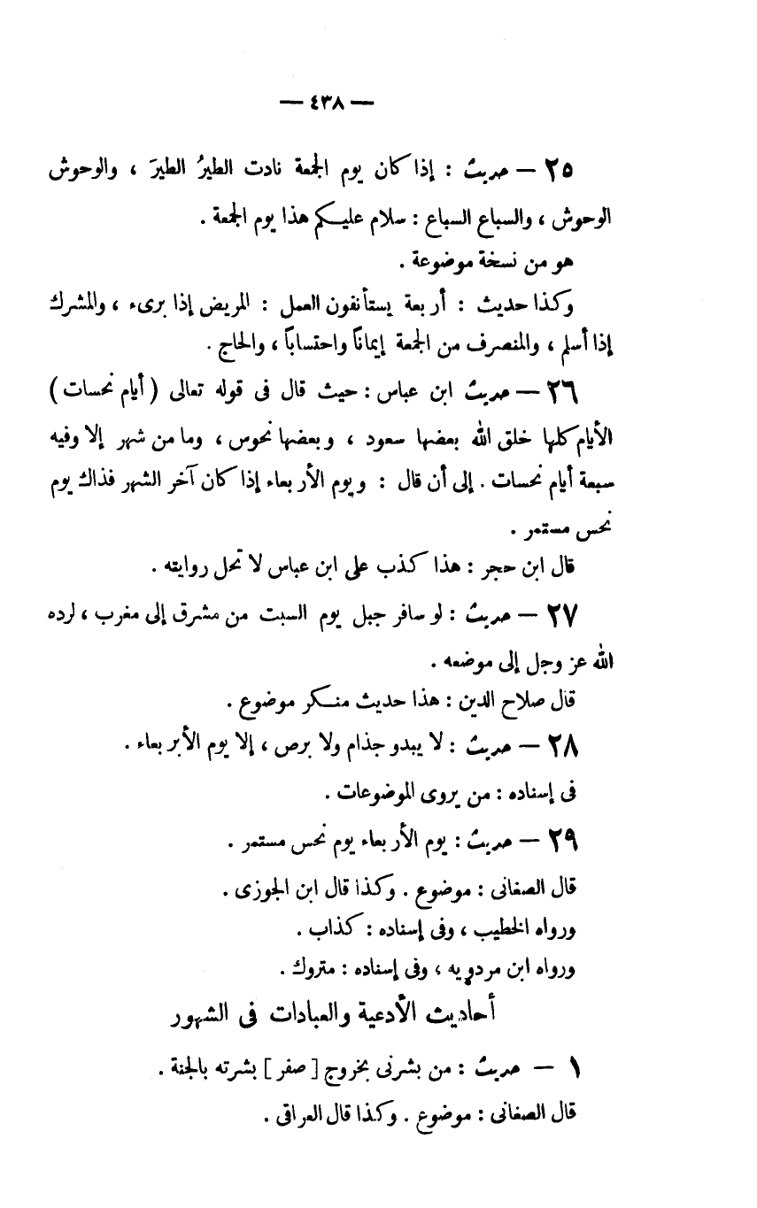 26 - حديث ابن عباس: حيث قال فِي قَوْلُهُ تَعَالَى (أَيَّامٍ نَحِسَاتٍ) الأَيَّامُ كُلُّهَا خَلَقَ اللَّهُ بَعْضَهَا سعود، وبعضها نحوس، وَمَا مِنْ شَهْرٍ إِلا وَفِيهِ سَبْعَةُ أَيَّامٍ نَحِسَاتٍ. إِلَى أَنْ قال: يوم الأَرْبِعَاءِ إِذَا كَانَ آخِرَ الشَّهْرِ فَذَاكَ يَوْمُ نَحْسٍ مُسْتَمِرٍّ.