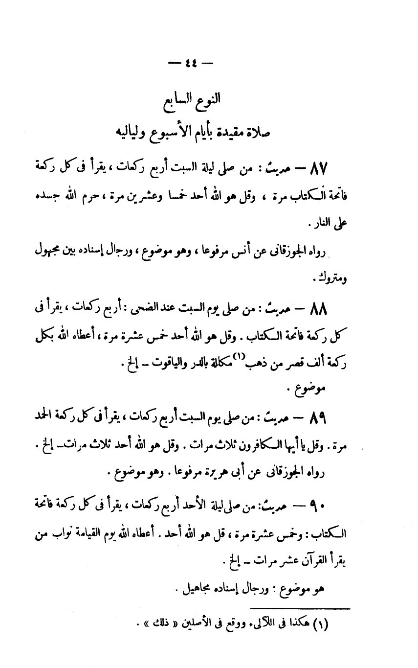 87 – حديث: "مَنْ صَلَّى لَيْلَةَ السَّبْتِ أَرْبَعَ رَكَعَاتٍ يَقْرَأُ فِي كُلِّ رَكْعَةٍ فاتحة الكتاب مرة وَقُلْ هُوَ اللَّهُ أَحَدٌ خَمْسًا وَعِشْرِينَ مَرَّةً حَرَّمَ اللَّهُ جَسَدَهُ عَلَى النَّارِ".
