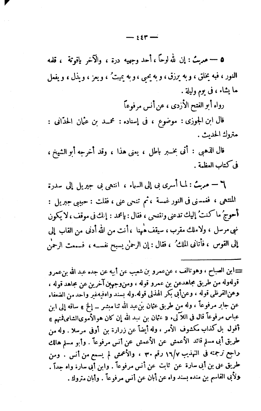 5 - حديث: "إِنَّ لِلَّهِ لَوْحًا، أَحَدُ وَجْهَيْهِ دُرَّةٌ، وَالآخَرُ يَاقُوتَةٌ، قَلَمُهُ النُّورُ، فيه يَخْلُقُ، وَبِهِ يَرْزُقُ، وَبِهِ يُحْيِي، وَبِهِ يُمِيتُ، وَيُعِزُّ، وَيُذِلُّ، وَيَفْعَلُ مَا يَشَاءُ، فِي يَوْمٍ وَلَيْلَةٍ".
