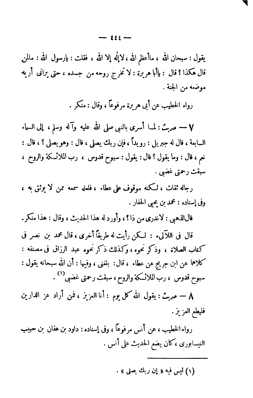 7 - حديث: "لَمَّا أُسْرِيَ بِالنَّبِيِّ صَلَّى اللَّهُ عَلَيْهِ وَآلِهِ وَسَلَّمَ، إِلَى السَّمَاءِ السَّابِعَةِ، قَالَ لَهُ جِبْرِيلُ: رُوَيْدًا، فَإِنَّ رَبَّكَ يُصَلِّي، قَالَ: وَهُوَ يصلي؟، قال: نعم، قال: ومايقول؟ قَالَ: يَقُولُ: سُبُّوحٌ قُدُّوسٌ، رَبُّ الْمَلائِكَةِ وَالرُّوحِ، سَبَقَتْ رَحْمَتِي غَضَبِي.