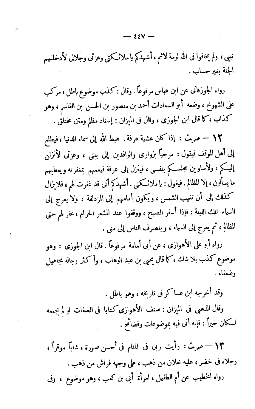 12 - حديث: "إِذَا كَانَ عَشِيَّةُ عَرَفَةَ. هَبَطَ اللَّهُ إِلَى سَمَاءِ الدُّنْيَا، فَيَطَّلِعُ إِلَى أَهْلِ الْمَوْقِفِ فَيَقُولُ: مَرْحَبًا بِزُوَّارِي وَالْوَافِدِينَ إِلَى بَيْتِي، وَعِزَّتِي لأُنْزِلَنَّ إِلَيْكُمْ، وَلأُسَاوِيَنَّ مَجْلِسَكُمْ بِنَفْسِي، فَيَنْزِلُ إِلَى عَرَفَةَ فَيَعُمُّهُمْ بِمَغْفَرَتِهِ وَيُعْطِيهِمْ مَا يَسْأَلُونَ، إِلا الْمَظَالِمَ. فَيَقُولُ: يَا مَلائِكَتِي. أُشْهِدُكُمْ أَنِّي قَدْ غَفَرْتُ لَهُمْ، فَلا يَزَالُ كَذَلِكَ إِلَى أَنْ تَغِيبَ الشَّمْسُ، ويكون أمامهم إلى الْمُزْدَلِفَةِ، وَلا يَعْرُجُ إِلَى السَّمَاءِ تِلْكَ اللَّيْلَةَ: فَإِذَا أَسْفَرَ الصُّبْحُ، وَوَقَفُوا عِنْدَ الْمَشْعَرِ الْحَرَامِ، غَفَرَ لَهُمْ حَتَّى الْمَظَالِمَ، ثُمَّ يَعْرُجُ إِلَى السَّمَاءِ، وَيَنْصَرِفُ النَّاسُ إِلَى مِنًى".