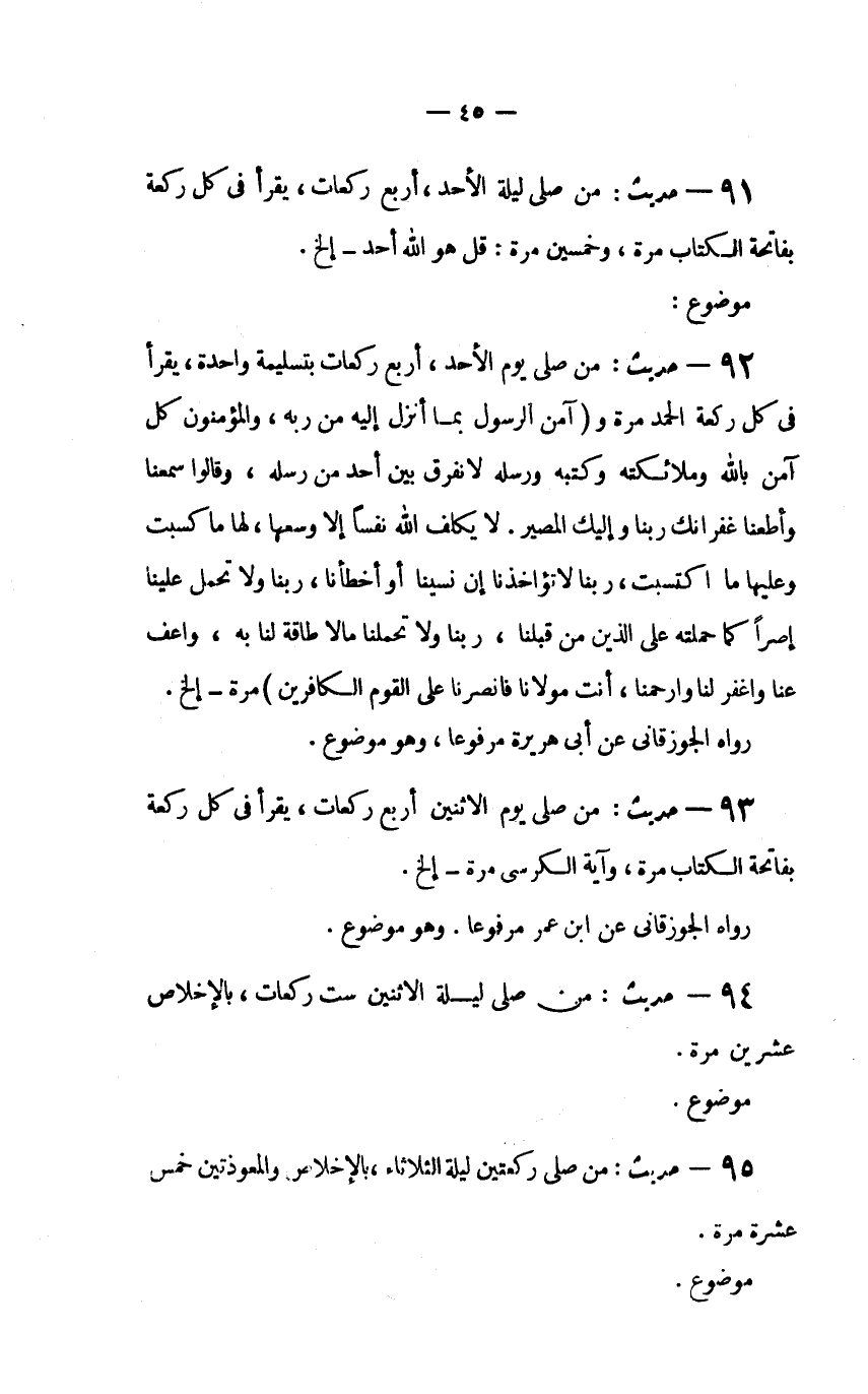 92 - حديث: " مَنْ صَلَّى يَومَ الأَحَدِ أَرْبَعَ رَكَعَاتٍ بِتَسْلِيمَةٍ وَاحِدَةٍ يَقْرَأُ فِي كُلِّ رَكْعَةٍ الْحَمْدُ مَرَّةً وَ (آمَنَ الرَّسُولُ بِمَا أُنْزِلَ إِلَيْهِ مِنْ رَبِّهِ وَالْمُؤْمِنُونَ كُلٌّ آمَنَ بِاللَّهِ وَمَلائِكَتِهِ وَكُتُبِهِ وَرُسُلِهِ لا نُفَرِّقُ بَيْنَ أَحَدٍ مِنْ رُسُلِهِ وَقَالُوا سَمِعْنَا وَأَطَعْنَا غُفْرَانَكَ رَبَّنَا وإليك المصير لا يُكَلِّفُ اللَّهُ نَفْسًا إِلا وُسْعَهَا لَهَا مَا كَسَبَتْ وَعَلَيْهَا مَا اكْتَسَبَتْ رَبَّنَا لا تُؤَاخِذْنَا إِنْ نَسِينَا أَوْ أَخْطَأْنَا رَبَّنَا وَلا تَحْمِلْ عَلَيْنَا إِصْرًا كَمَا حَمَلْتَهُ عَلَى الَّذِينَ مِنْ قَبْلِنَا رَبَّنَا وَلا تُحَمِّلْنَا مَا لا طَاقَةَ لَنَا بِهِ وَاعْفُ عَنَّا وَاغْفِرْ لَنَا وَارْحَمْنَا أَنْتَ مَوْلانَا فانصرنا على القوم الكافرين) مَرَّةً _ إلخ ".