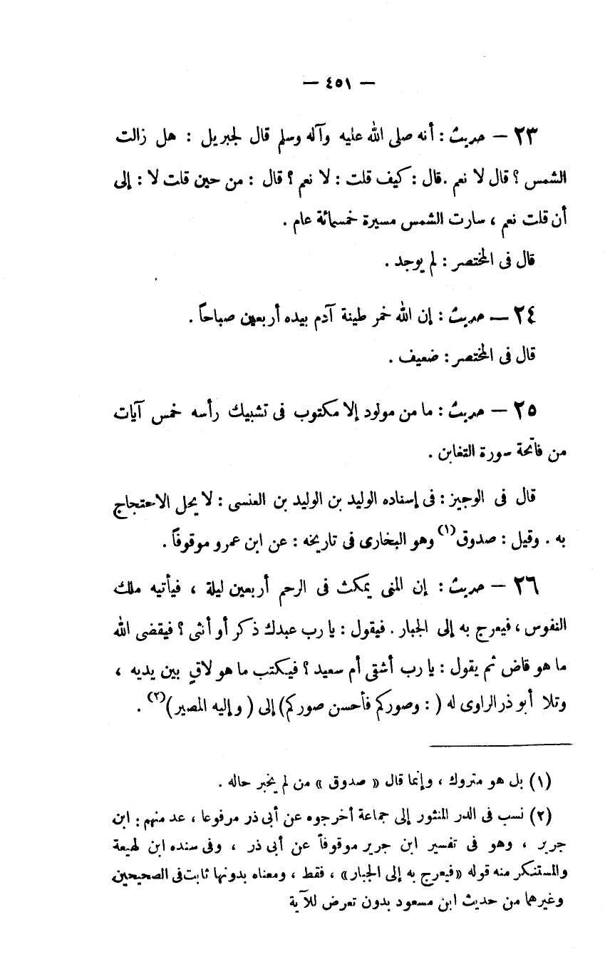 23 - حديث: "إِنَّهُ صَلَّى اللَّهُ عَلَيْهِ وَآلِهِ وَسَلَّمَ قَالَ لِجِبْرِيلَ: هَلْ زَالَتِ الشَّمْسُ؟ قَالَ لا نَعَمْ. قَالَ كَيْفَ قُلْتَ: لا نَعَمْ؟ قَالَ: مِنْ حِينِ قُلْتُ لا: إِلَى أَنْ قُلْتُ نَعَمْ، سَارَتِ الشَّمْسُ مسيرة خمسمائة عَامٍ.