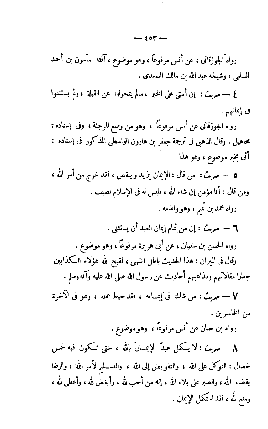 8 - حديث: "لا يُكْمِلُ عَبْدٌ الإِيمَانَ بِاللَّهِ، حَتَّى تَكُونَ فِيهِ خَمْسُ خِصَالٍ: التَّوَكُّلُ عَلَى اللَّهِ، وَالتَّفْوِيضُ إِلَى اللَّهِ، وَالتَّسْلِيمُ لأَمْرِ اللَّهِ، وَالرِّضَا بِقَضَاءِ اللَّهِ، وَالصَّبْرُ عَلَى بَلاءِ اللَّهِ، إِنَّهُ مَنْ أَحَبَّ لِلَّهِ، وَأَبْغَضَ لِلَّهِ، وَأَعْطَى لِلَّهِ، وَمَنَعَ لِلَّهِ، فَقَدِ اسْتَكْمَلَ الإِيمَانَ".