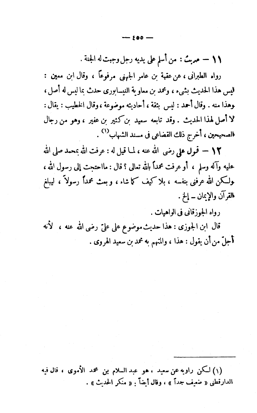 (1) لكن راويه عن سعيد، هو عبد السلام بن محمد الأموي، قال فيه الدارقطني (ضعيف جداً) ، وقال أيضاً: (منكر الحديث) .