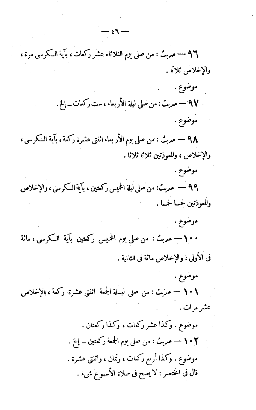 100 - حديث: "مَنْ صَلَّى يَوْمَ الْخَمِيسِ رَكْعَتَيْنِ بِآيَةِ الْكُرْسِيِّ مِائَةً فِي الأُولَى وَالإِخْلاصِ مِائَةً فِي الثَّانِيَةِ.