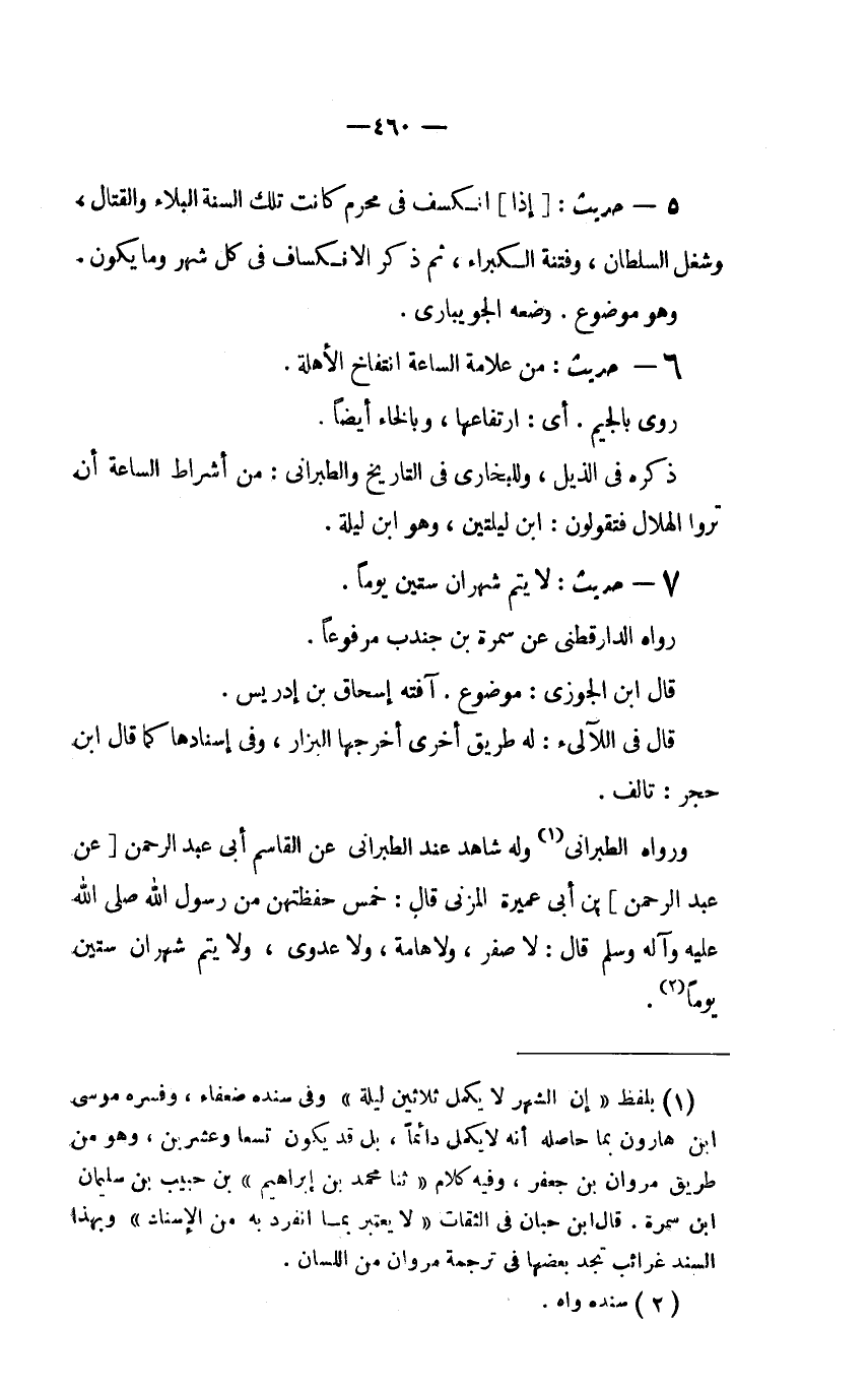 (1) بلفظ (إن الشهر لا يكمل ثلاثين ليلة) وفي سنده ضعفاء، وفسره موسى ابن هارون بما حاصله أنه لا يكمل دائماً، بل قد يكون تسعاً وعشرين، وهو من طريق مروان بن حعفر، وفيه كلام (ثنا محمد بن إبراهيم) بن حبيب بن سليمان ابن سمرة. قال ابن حبان في الثقات (لا يعتبر بما انفرد به من الإسناد) وبهذا السند غرائب تجد بعضها في ترجمة مروان من اللسان.