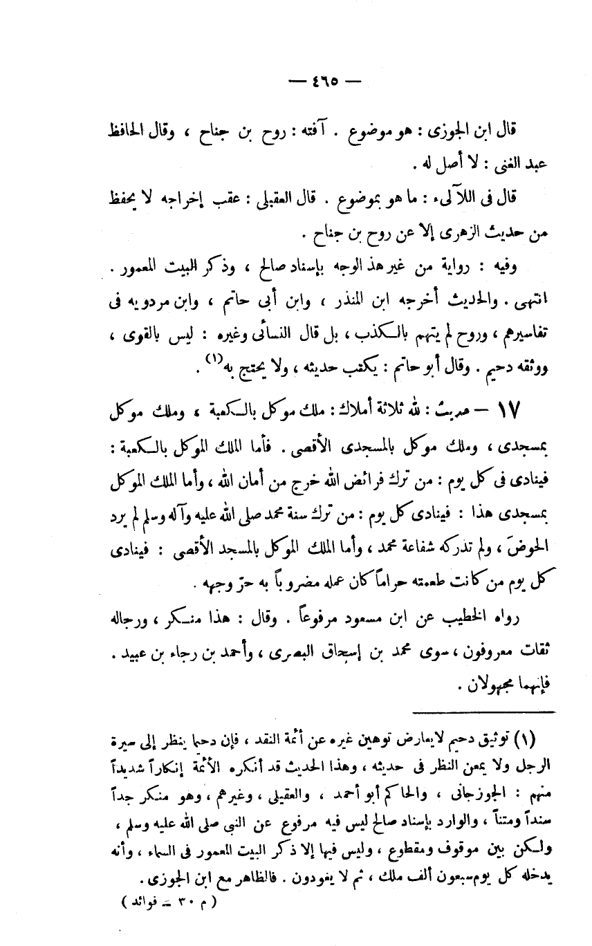 (1) توثيق دحيم لا يعارض توهيم غيره عن أئمة النقد، فإن دحيماً ينظر إلى سيرة الرجل ولا يمعن النظر في حديثه، وهذا الحديث قد أنكره الأئمة إنكاراً شديداً منهم: الجوزجاني، والحاكم أبو أحمد، والعقيلي، وغيرهم، وهو منكر جداً سنداً ومتناً، والوارد بإسناد صالح ليس فيه مرفوع عَنِ النَّبِيِّ صَلَّى اللَّهُ عَلَيْهِ وسلم، ولكن بين موقوف ومقطوع، وليس فيها إلا ذكر البيت المعمور في السماء، وأنه يدخله كل يوم سبعون ألف ملك، ثم لا يعودون. فالظاهر مع ابن الجوزي.