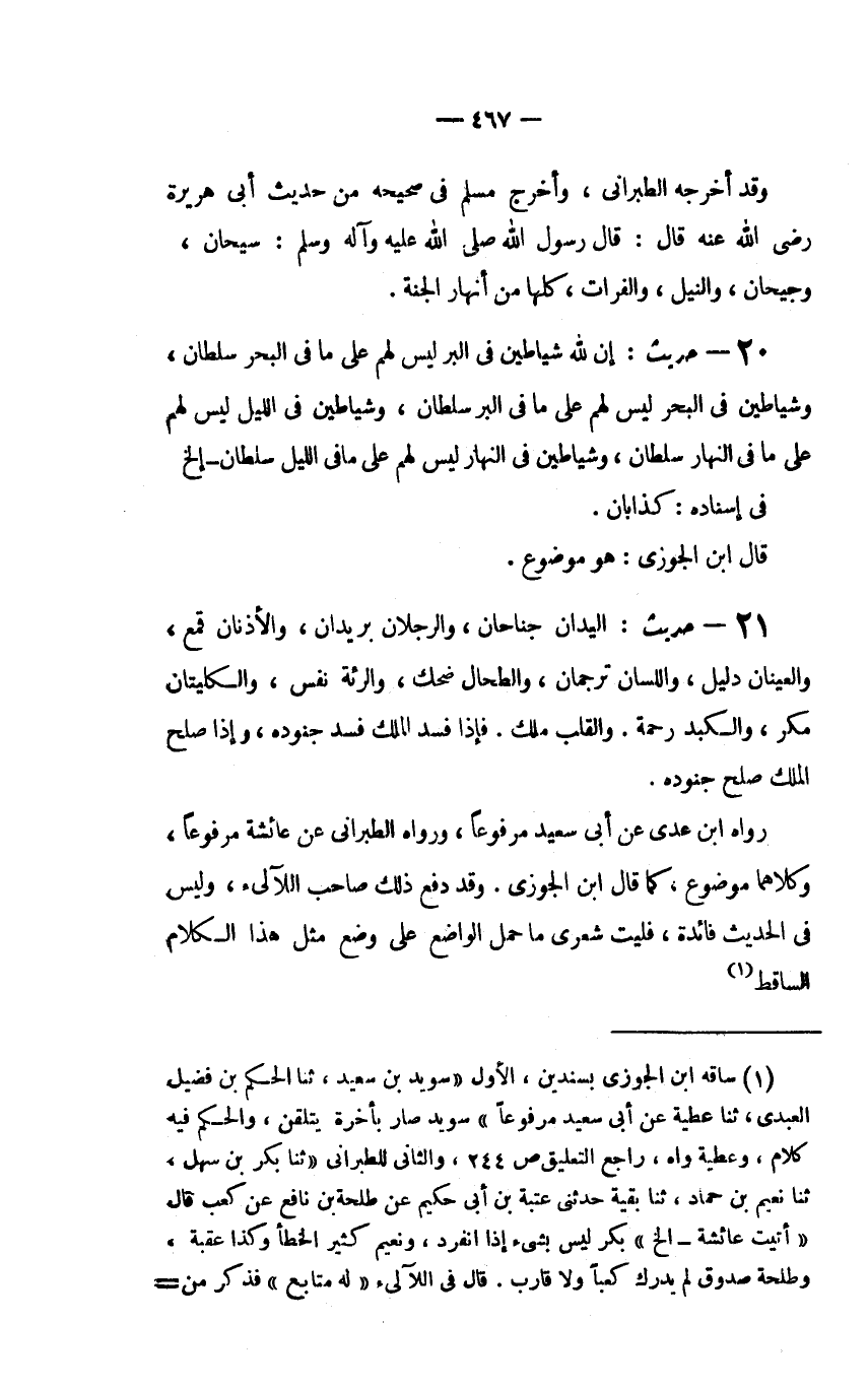 20 - حديث: "إِنَّ لِلَّهِ شَيَاطِينَ فِي الْبَرِّ لَيْسَ لَهُمْ عَلَى مَا فِي الْبَحْرِ سُلْطَانٌ، وَشَيَاطِينَ فِي الْبَحْرِ ليس لهم مَا فِي الْبَرِّ سُلْطَانٌ، وَشَيَاطِينَ فِي اللَّيْلِ لَيْسَ لَهُمْ عَلَى مَا فِي النَّهَارِ سُلْطَانٌ، وَشَيَاطِينَ فِي النَّهَارِ لَيْسَ لَهُمْ عَلَى مَا فِي اللَّيْلِ سُلْطَانٌ _ إلخ.