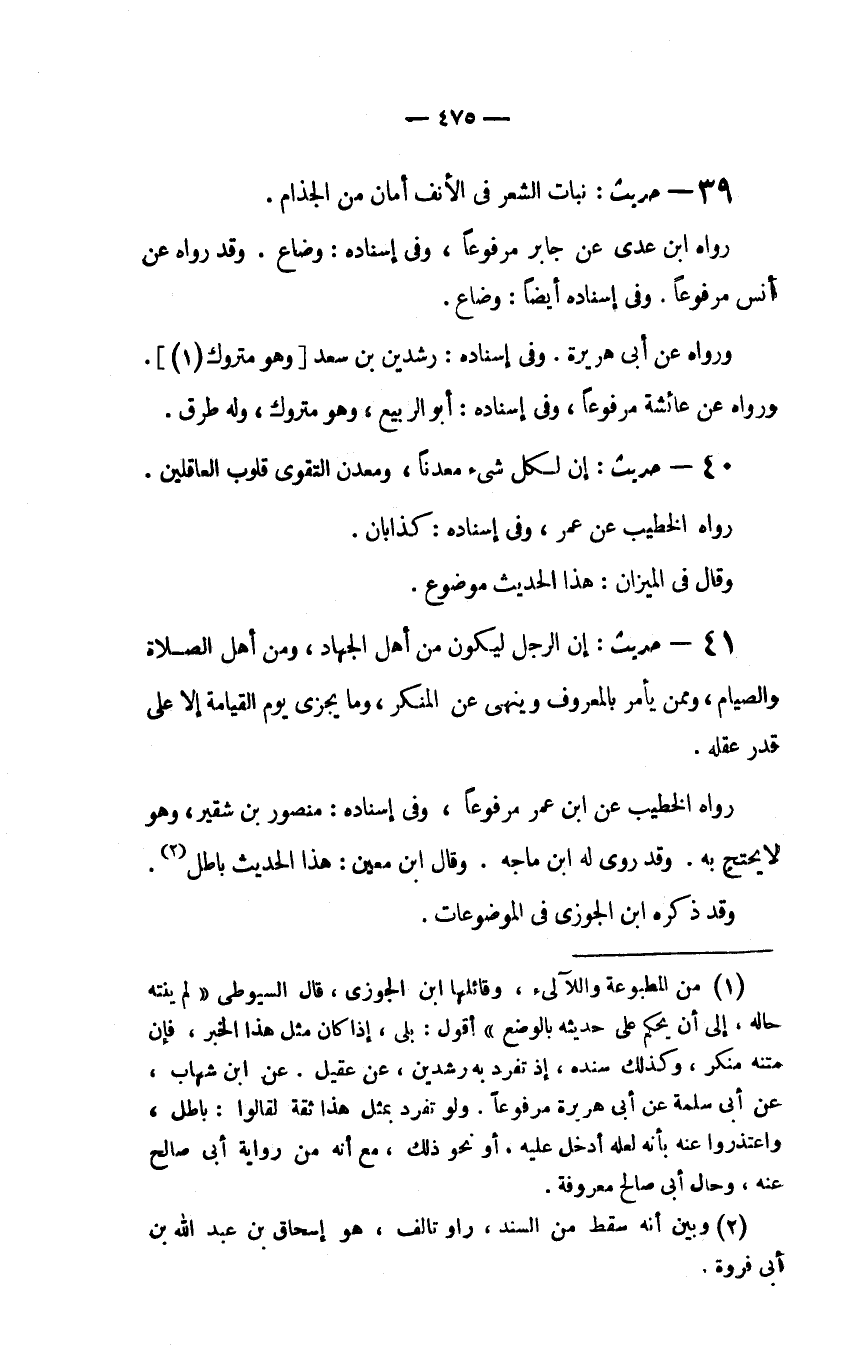 (1) من المطبوعة واللآلىء، وقائلها ابن الجوزي، قال السيوطي (لم ينتهي حاله، إلى أن يحكم على حديثه بالوضع) أقول: بلى، إذا كان مثل هذا الخبر، فإن متنه منكر، وكذلك سنده، إذ تفرد به رشدين، عن عقيل. عن ابن شهاب، عن أبي سلمة عن أبي هريرة مرفوعاً. ولو تفرد بمثل هذا ثقة لقالوا باطل، واعتذروا عنه بأنه لعله أدخل عليه، أو نحو ذلك، مع أنه من وراية أبي صالح عنه، وحال أبي صالح معروفة