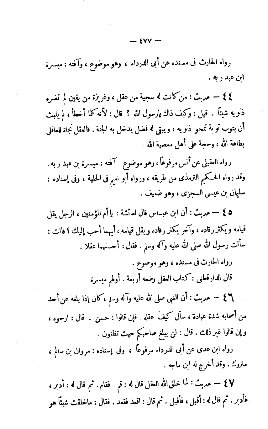 47 - حديث: "لَمَّا خَلَقَ اللَّهُ الْعَقْلَ قَالَ لَهُ: قُمْ. فَقَامَ. ثُمَّ قَالَ لَهُ: أَدْبِرْ، فَأَدْبَرَ. ثُمَّ قَالَ لَهُ: أَقْبِلْ، فَأَقْبَلَ. ثُمَّ قَالَ: اقْعُدْ فَقَعَدَ. فَقَالَ: مَا خَلَقْتُ شَيْئًا هُوَ