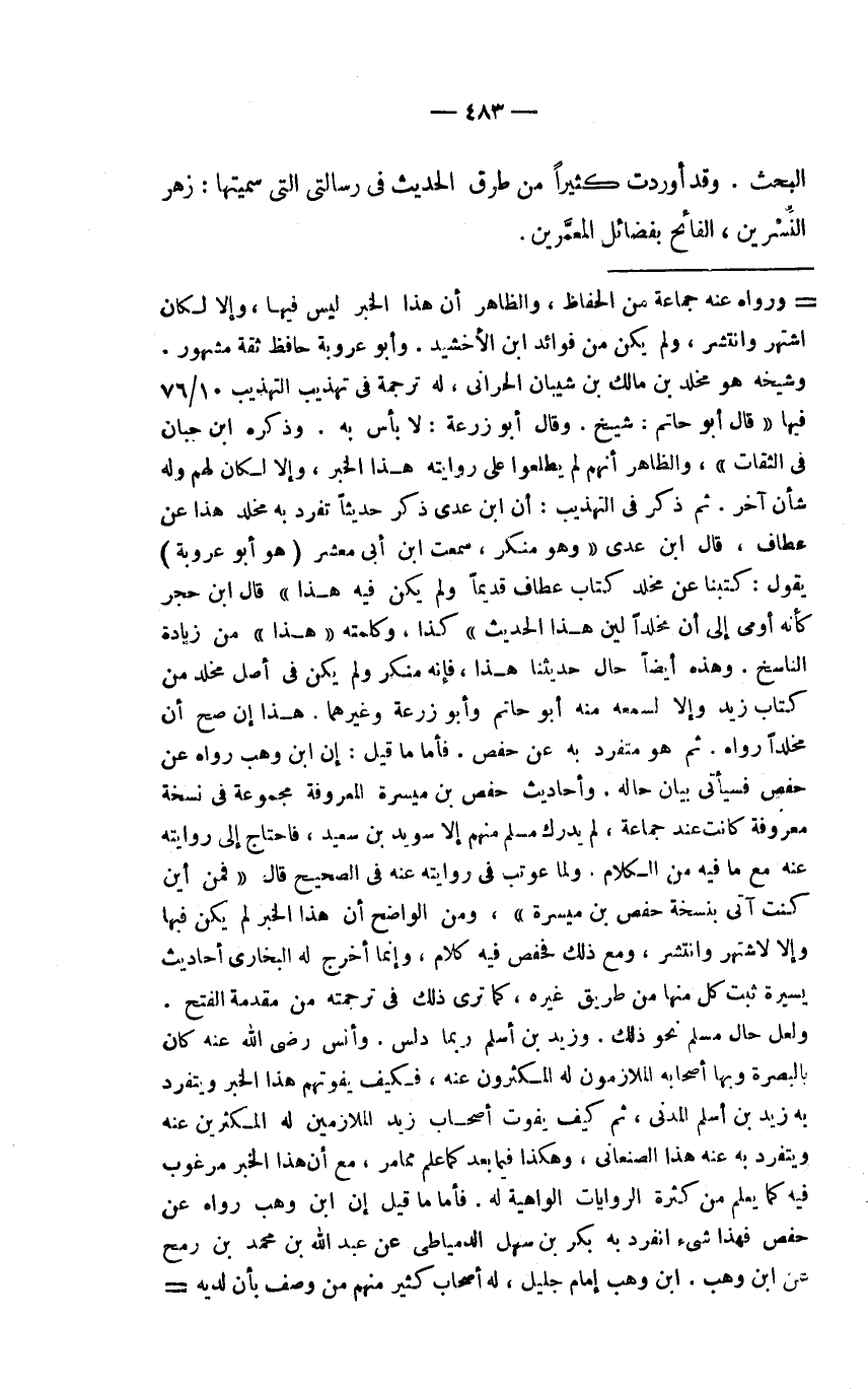 =. ورواه عنه جماعة من الحفاظ، والظاهر أن هذا الخبر ليس فيها، وإلا لكان اشتهر وانتشر، ولم يكن من فوائد ابن الأخشيد. وأبو عروبة حافظ ثقة مشهور. وشيخه هو مخلد بن مالك بن شيبان الحراني، له ترجمة في تهذيب التهذيب 10/76 فيها (قال أبو حاتم: شيخ. وقال أبو زرعة: لا بأس به. وذكره ابن حبان في الثقات) ، والظاهر أنهم لم يطلعوا على روايته هذا الخبر، وإلا لكان لهم وله شأن آخر. ثم ذكر في التهذيب: أن ابن عدي ذكر حديثاً تفرد به مخلد هذا عن عطاف، قال ابن عدي (وهو منكر، سمعت ابن أبي معشر (هو أبو عروبة) يقول: كتبنا عن مخلد كتاب عطاف قديماً ولم يكن فيه هذا) قال ابن حجر كأنه أومى إلى أن مخلداً لين هذا الحديث) كذا، وكلمته (هذا) من زيادة الناسخ. وهذه أيضاً حال حديثنا هذا، فإنه منكر ولم يكن في أصل مخلد من كتاب زيد وإلا لسمعه منه أبو حاتم وأبو زرعة وغيرهما. هذا إن صح أن مخلداً رواه. ثم هو متفرد به عن حفص. فأما ما قيل: إن ابن وهب رواه عن حفص فسيأتي بيان حاله. وأحاديث حفص بن ميسرة المعروفة مجموعة في نسخة معروفة كانت عند جماعة، ولم يدرك مسلم منهم إلا سويد بن سعيد، فاحتاج إلى روايته عنه مع ما فيه من الكلام. ولما عوتب في روايته عنه في الصحيح قال (فمن أين كنت آتي بنسخة حفص بن ميسرة) ، ومن الواضح أن هذا الخبر لم يكن فيها والا لاشتهر وانتشر، ومع ذلك فحفص فيه كلام، وإنما أخرج له البخاري أحاديث يسيرة ثبت كل منها من طريق غيره، كما ترى ذلك في ترجمته في مقدمة الفتح. ولعل حال مسلم نحو ذلك. وزيد بن أسلم ربما دلس. وأنس رضي الله عنه كان بالبصرو وبها أصحابه الملازمون له المكثرون عنه، فكيف يفوتهم هذا الخبر ويتفرد به زيد بن أسلم المدني، ثم كيف يفوت أصحاب زيد الملازمين له المكثرين عنه ويتفرد به عنه هذا الصنعاني، وهكذا فيما بعد كما علم مما مر، مع أن هذا الخبر مرغوب فيه كما يعلم من كثرة الروايات الواهية له. فأما ام قيل إن ابن وهب رواه عن حفص فهذا شيء انفرد به بكر بن سهل الدمياطي عن عبد الله بن محمد بن رمح عن ابن وهب. ابن وهب إمام جليل، له أصحاب كثير منهم من وصف بأن لديه=