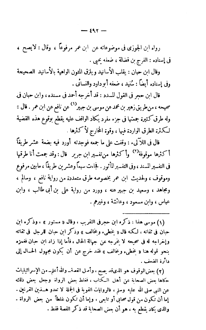 (1) موسى هذا: ذكره ابن حجر في التقريب، وقالب (مستور) ، وذكره ابن حبان في ثقاته، لكنه قال (يخطىء ويخالف) وذكر ابن حبان للرجل في ثقاته وإخراجه له في صحيحه لا يخرجه عن جهالة الحال، فأما إذا زاد ابن حبان فغمزه بنحو قوله هنا (يخطىء ويخالف) فقد خرج عن أن يكون مجهول الحال إلى دائرة الضعف