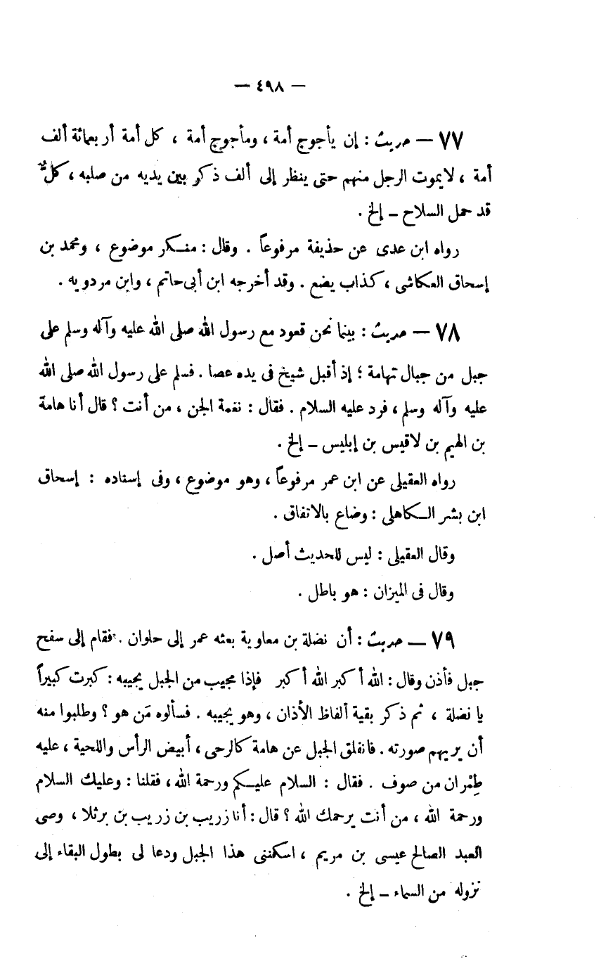 79 - حديث: "إِنَّ نَضْلَةَ بْنَ مُعَاوِيَةَ بَعَثَهُ عُمَرُ إِلَى حُلْوَانَ. فَقَامَ إِلَى سَفْحِ جَبَلٍ فَأَذَّنَ وَقَالَ: اللَّهُ أكبر الله أكبر فإذ مُجِيبٌ مِنَ الْجَبَلِ يُجِيبُهُ: كَبَّرْتَ كَبِيرًا يَا نَضْلَةُ، ثُمَّ ذَكَرَ بَقِيَّةَ أَلْفَاظِ الأَذَانَ، وَهُوَ يُجِيبُهُ. فَسَأَلُوهُ مَنْ هُوَ؟ وَطَلَبُوا مِنْهُ أَنْ يُرِيَهُمْ صُورَتَهُ. فَانْفَلَقَ الْجَبَلُ عَنْ هَامَةٍ كَالرَّحَى، أَبْيَضِ الرَّأْسِ وَاللِّحْيَةِ، عَلَيْهِ طِمْرَانِ مِنْ صُوفٍ. فَقَالَ: السَّلامُ عَلَيْكُمْ وَرَحْمَةُ اللَّهِ، فَقُلْنَا: وَعَلَيْكَ السَّلامُ وَرَحْمَةُ اللَّهِ، مَنْ أَنْتَ يَرْحَمُكَ اللَّهُ؟ قَالَ: أنا زريب بْنُ زَرِيبِ بْنِ بَرْثَلا، وَصِيُّ العبد الصالح عيسى بن مَرْيَمَ، أَسْكَنَنِي هَذَا الْجَبَلَ وَدَعَا لِي بِطُولِ الْبَقَاءِ إِلَى نُزُولِهِ من السماء _ إلخ".