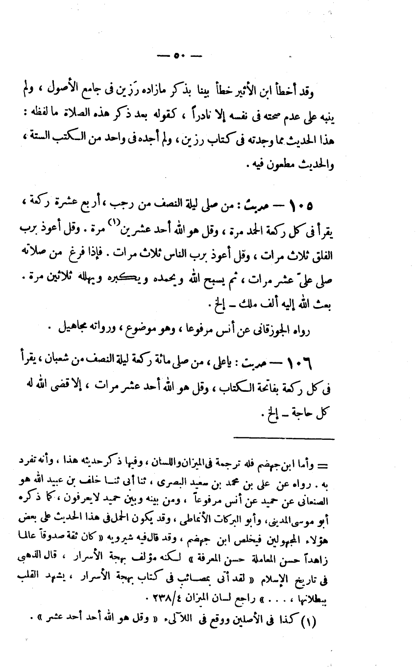 105 - حديث: "مَنْ صَلَّى لَيْلَةَ النِّصْفِ مِنْ رَجَبٍ أَرْبَعَ عَشْرَةَ رَكْعَةً يَقْرَأُ فِي كُلِّ رَكْعَةٍ الْحَمْدُ مَرَّةً وَ {قُلْ هُوَ اللَّهُ أَحَدٌ} عشرين (1) مرة وَ {قُلْ أَعُوذُ بِرَبِّ الْفَلَقِ} ثلاث مَرَّاتٍ وَ {قُلْ أَعُوذُ بِرَبِّ النَّاسِ} ثَلاثَ مَرَّاتٍ فَإِذَا فَرَغَ مِنْ صَلاتِهِ صَلَّى عَلَيَّ عَشْرِ مَرَّاتٍ ثُمَّ يُسَبِّحُ اللَّهَ وَيَحْمَدُهُ وَيُكَبِّرُهُ وَيُهَلِّلُهُ ثَلاثِينَ مَرَّةً. بَعَثَ اللَّهُ إِلَيْهِ أَلْفَ مَلَكٍ _ إلخ".