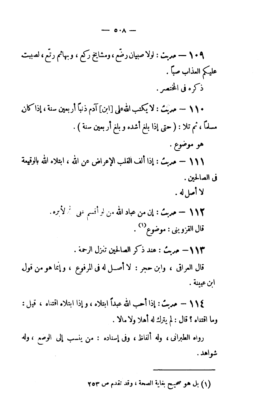109 - حديث: "لَوْلا صِبْيَانٌ رُضَّعٌ، وَمَشَايِخُ رُكَّعٌ، وَبَهَائِمُ رُتَّعٌ، لَصَبَبْتُ عَلَيْكُمُ الْعَذَابَ صباً. ذكره في المختصر.