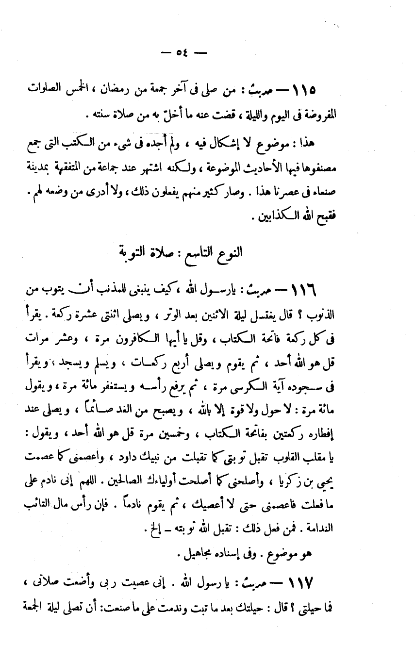 116 - حديث: "يَا رَسُولَ اللَّهِ كَيْفَ يَنْبَغِي لِلْمُذْنِبِ أَنْ يَتُوبَ مِنَ الذُّنُوبِ؟ قَالَ يَغْتَسِلُ لَيْلَةَ الاثْنَيْنِ بَعْدَ الْوِتْرِ وَيُصَلِّي اثْنَتَيْ عَشْرَةَ رَكْعَةً يَقْرَأُ فِي كُلِّ رَكْعَةٍ فَاتِحَةَ الْكِتَابِ وَقُلْ يَا أَيُّهَا الْكَافِرُونَ مَرَّة وَعَشْرَ مَرَّاتٍ قُلْ هُوَ اللَّهُ أَحَدٌ ثُمَّ يَقُومُ وَيُصَلِّي أربع ركعات ويسلم وَيَسْجُدُ وَيَقْرَأُ فِي سُجُودِهِ آيَةَ الْكُرْسِيِّ مَرَّةً ثُمَّ يَرْفَعُ رَأْسَهُ وَيَسْتَغْفِرُ مِائَةَ مَرَّةٍ وَيَقُولُ مِائَةَ مَرَّةٍ: لا حَوْلَ وَلا قُوَّةَ إِلا بِاللَّهِ وَيُصْبِحُ مِنَ الْغَدِ صَائِمًا وَيُصَلِّي عِنْدَ إِفْطَارِهِ رَكْعَتَيْنِ بِفَاتِحَةِ الْكِتَابِ وَخَمْسِينَ مَرَّةً قُلْ هُوَ اللَّهُ أَحَدٌ وَيَقُولُ: يَا مُقَلِّبَ الْقُلُوبِ تَقَبَّلْ تَوْبَتِي كَمَا تَقَبَّلْتَ مِنْ نَبِيِّكَ دَاوُدَ وَاعْصِمْنِي كَمَا عَصَمْتَ يَحْيَى بْنَ زَكَرِيَّا وَأَصْلِحْنِي كَمَا أَصْلَحْتَ أَوْلِيَاءَكَ الصَّالِحِينَ اللَّهُمَّ إِنِّي نَادِمٌ عَلَى مَا فَعَلْتُ فَاعْصِمْنِي حَتَّى لا أَعْصِيَكَ ثُمَّ يَقُومُ نَادِمًا فَإِنَّ رَأْسَ مَالِ التَّائِبِ النَّدَامَةُ فَمَنْ فَعَلَ ذَلِكَ: تَقَبَّلَ اللَّهُ تَوْبَتَهُ _ إلخ.