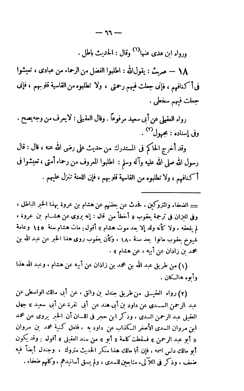 (2) رواه العقيلي من طريق جندل بن والق، عن أبي مالك الواسطي عن عبد الرحمن السدي عن داود بن أبي هند عن أبي نقرة عن أبي سعيد) جهل العقيلي عبد الرحمن السدي، وذكر ابن حجر في اللسان أن الخبر يروى عن محمد ابن مروان السدي الأصغر الكذاب عن داود به، فلعل كنية محمد بن مروان (أبو عبد الرحمن) فسقطت كلمة (أبو) من سند العقيلي) أقول: وقد يكون أبو مالك دلس إسمه، فإن أبا مالك هذا منكر الحديث متروك، وجندل أيضاً فيه ضعف، وذكر في اللآلىء متابعين للسدي، ولم يسق أسانيدهم، وكلهم ضعفاء.