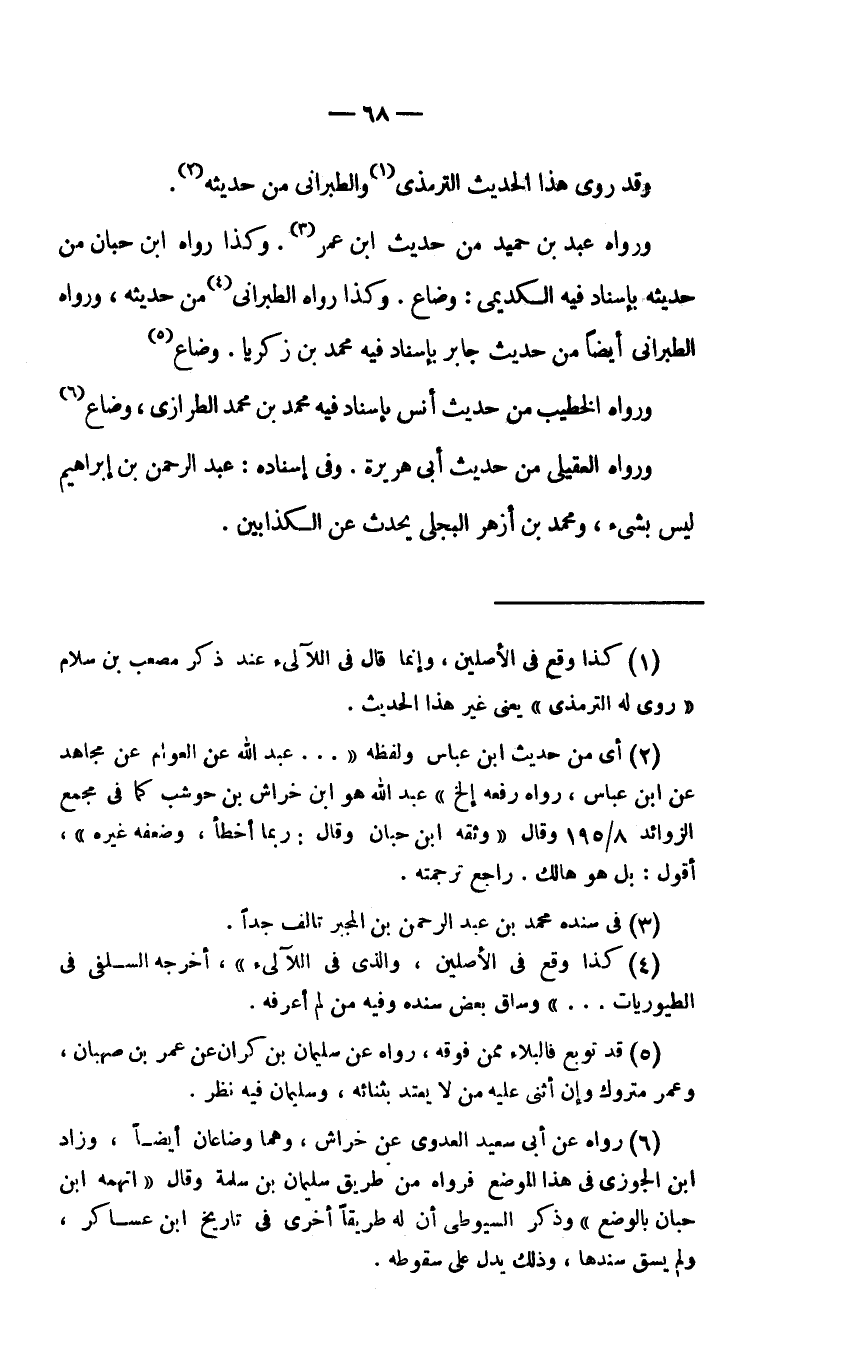(6) رواه عن أبي سعيد العدوي عن خراش، وهما وضاعان أيضاً، وزاد ابن الجوزي في هذا الموضع فرواه من طريق سليمان بن سلمة وقال (اتهمه ابن حبان بالوضع) وذكر السيوطي أن له طريقاً أخرى في تاريخ ابن عساكر، ولم يسق سندها، وذلك يدل على سقوطه".