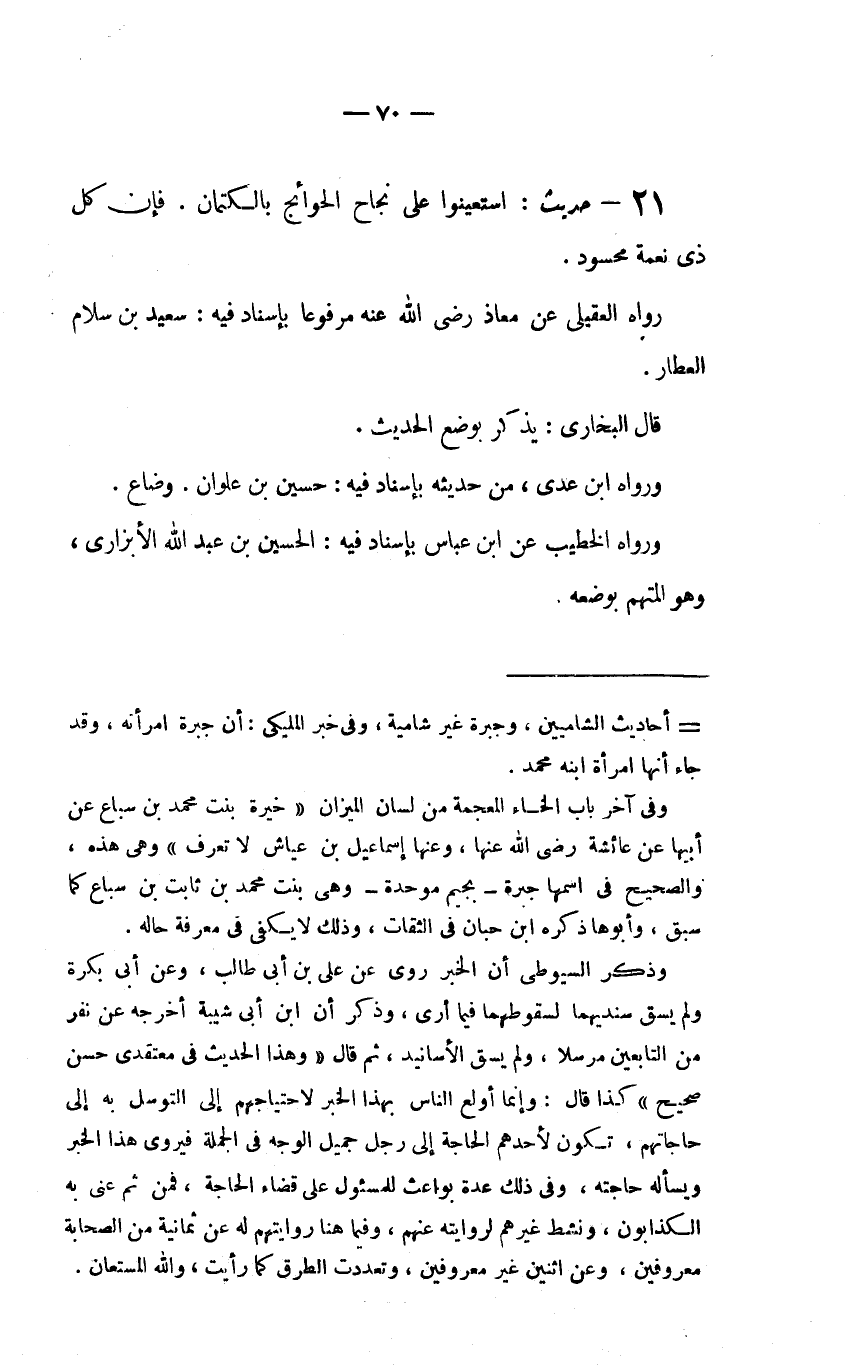 21 - حديث: "اسْتَعِينُوا عَلَى نَجَاحِ الْحَوَائِجِ بِالْكِتْمَانِ فَإِنَّ كُلَّ ذِي نِعْمَةٍ مَحْسُودٌ".