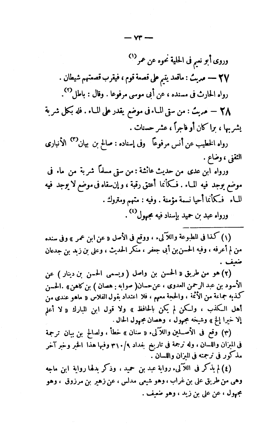 (4) لم يذكر في اللآلىء رواية عبد بن حميد، وذكر بدلها رواية ابن ماجه وهي من طريق علي ابن غراب، وهو شيعي مدلس، عن زهير بن مرزوق، وهو مجهول، عن علي بن زيد، وهو ضعيف.