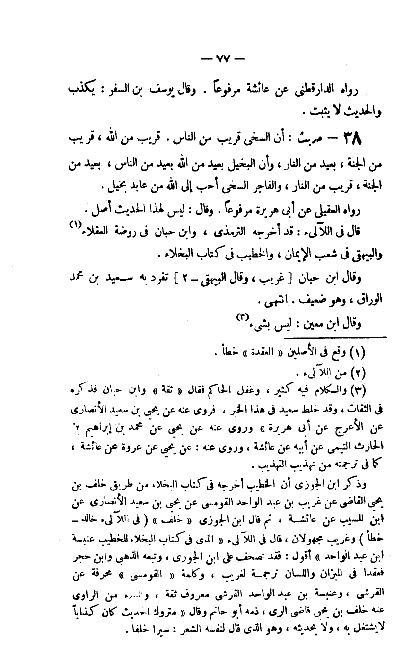 وذكر ابن الجوزي أن الخطيب أخرجه في كتاب البخلاء من طريق خلف بن يحيى القاضي عن غريب بن عبد الواحد القومسي عن يحيى بن سعيد الأنصاري عن ابن المسيب عن عائشة، ثم قال ابن الجوزي (خلف) [في اللآلىء خالد خطأ] وغريب مجهولان، قال في اللآلىء (الذي في كتاب البخلاء للخطيب عنبسة ابن عبد الواحد) أقول: فقد تصحف علي ابن الجوزي، وتبعه الذهبي وابن حجر فعقدا في الميزان واللسان ترجمة لغريب، وكلمة (القومسي) محرفة عن القرشي، وعنبسة بن عبد الواحد القرشي معروف ثقة، والبلاء من الراوي عنه خلف بن يحيى قاضي الري، ذمه أبو حاتم وقال (متروك الحديث كان كذاباً لا يشتغل به، ولا بحديثه، وهو الذي قال لنفسه الشعر: سيرا خلفاً.