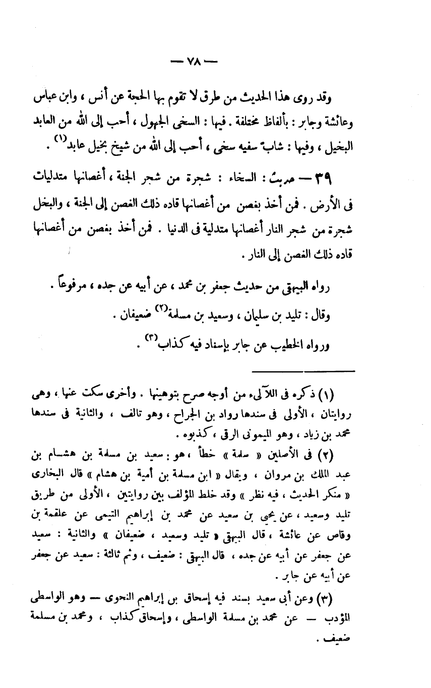 وَقَدْ رَوَى هَذَا الْحَدِيثَ مِنْ طرق لا تَقُومُ بِهَا الْحُجَّةُ عَنْ أَنَسٍ وَابْنِ عَبَّاسٍ وَعَائِشَةَ وَجَابِرٍ: بِأَلْفَاظٍ مُخْتَلِفَةٍ فِيهَا: السَّخِيُّ الْجَهُولُ أَحَبُّ إِلَى اللَّهِ مِنَ الْعَابِدِ الْبَخِيلِ وَفِيهَا: شَابٌّ سَفِيهٌ سَخِيٌّ أَحَبُّ إِلَى اللَّهِ مِنْ شَيْخٍ بخيل عابد (1) .