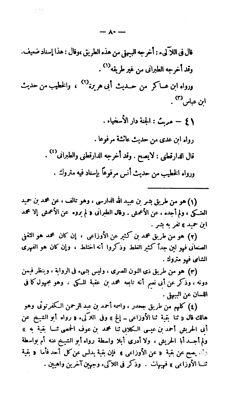 (4) كلهم من طريق جحدر، واسمه أحمد بن عبد الرحمن الكفرتوثي وهو هالك قال (ثنا بقية ثنا الأوزاعي إلخ) وفي اللآلىء (رواه أبو الشيخ عن أبي الحريش أحمد بن عيسى الكلابي ثنا محمد بن عوف الحمصي ثنا بقية به) ولم أجد أبا الحريش، ولاأدري أبلا واسطة رواه أبو الشيخ عنه أم بواسطة وقد يصح عن بقية (عن الأوزاعي) فإن بقية يدلس عن كل أحد فأما (بقية ثنا الأوزاعي) فهيهات. وذكر في اللآلىء وجهين آخرين واهيين