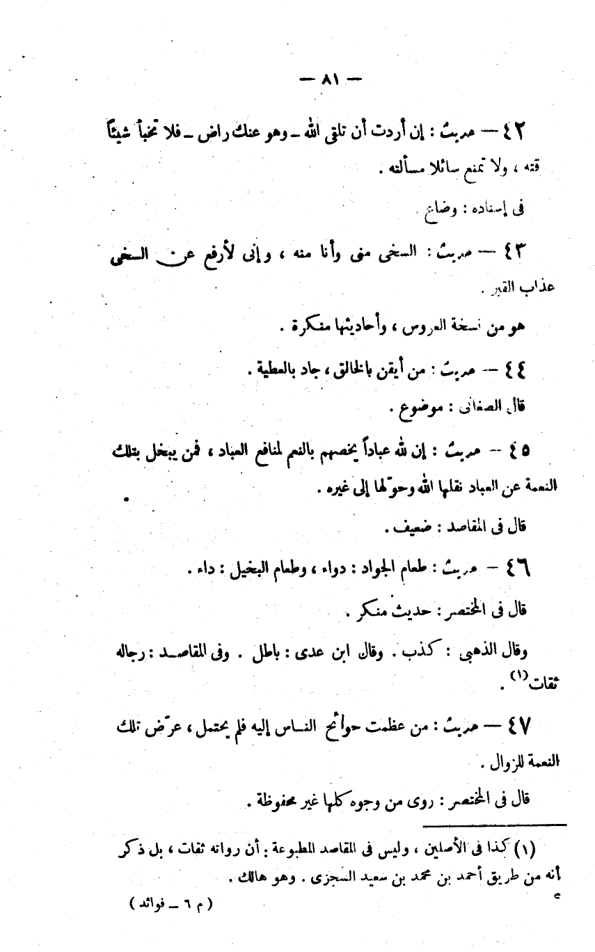 (1) كذا في الأصلين، وليس في المقاصد المطبوعة: أن رواته ثقات، بل ذكر أنه من طريق أحمد بن محمد بن سعيد السجزي. وهو هالك.
