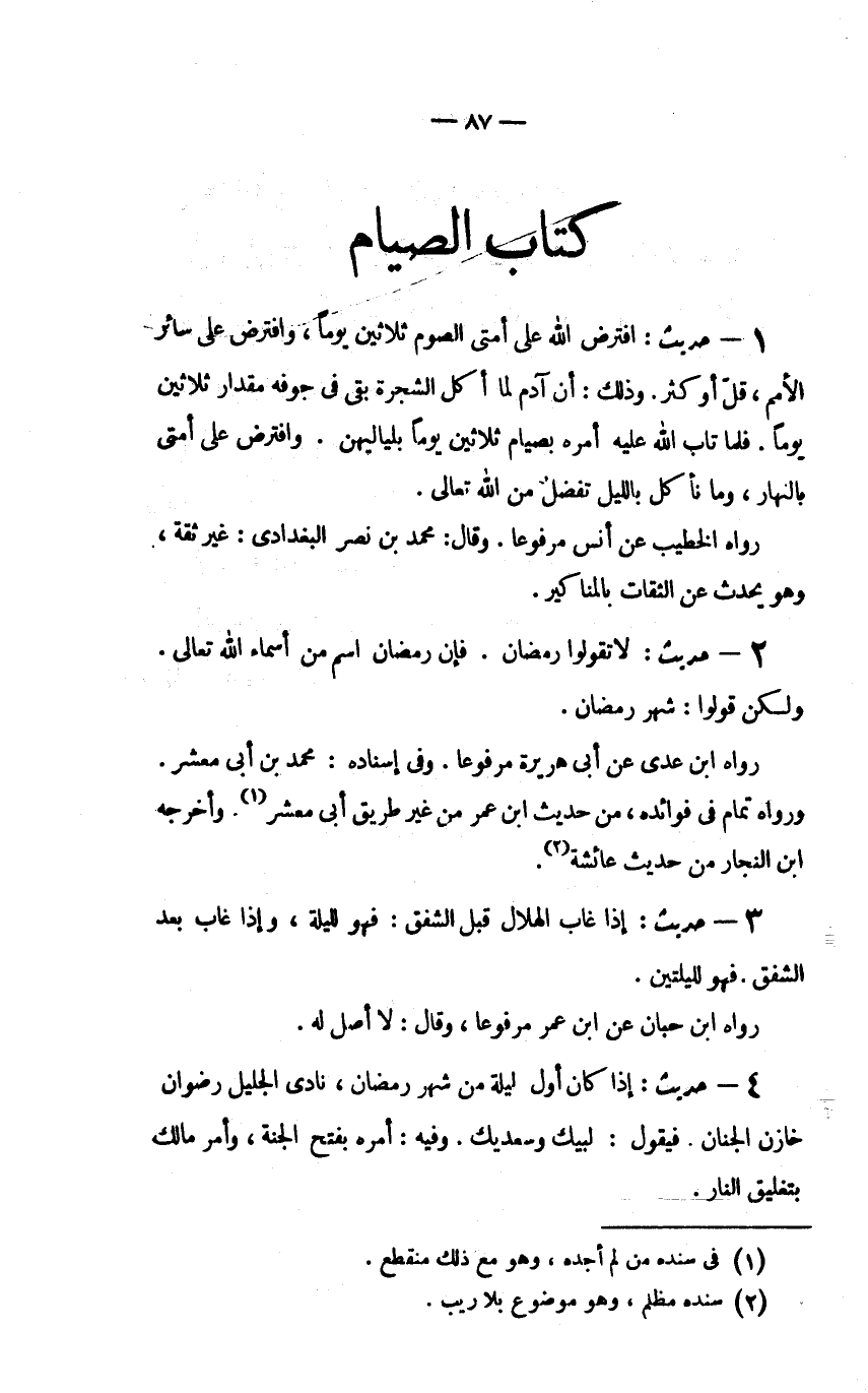 1 - حديث: "افْتَرَضَ اللَّهُ عَلَى أُمَّتِي الصَّوْمَ ثَلاثِينَ يَوْمًا وَافْتَرَضَ عَلَى سَائِرِ الأُمَمِ قَلَّ أَوْ كَثُرَ وَذَلِكَ: أَنَّ آدَمَ لَمَّا أَكَلَ الشَّجَرَةَ بَقَى فِي جَوْفِهِ مِقْدَارُ ثَلاثِينَ يَوْمًا فَلَمَّا تَابَ اللَّهُ عَلَيْهِ أَمَرَهُ بِصِيَامِ ثَلاثِينَ يَوْمًا بِلَيَالِيهِنَّ وَافْتَرَضَ عَلَى أُمَّتِي بِالنَّهَارِ وَمَا نَأْكُلُ بِاللَّيْلِ تَفْضُلٌ مِنَ اللَّهِ تَعَالَى".