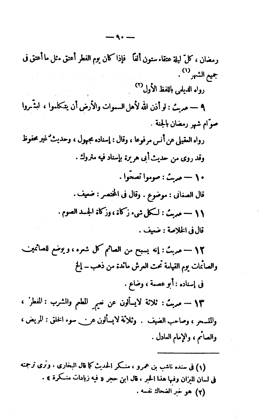 9 - حديث: "لَوْ أَذِنَ اللَّهُ لأَهْلِ السَّمَوَاتِ وَالأَرْضِ أَنْ يَتَكَلَّمُوا لَبَشَّرُوا صُوَّامَ شَهْرِ رَمَضَانَ بِالْجَنَّةِ. رَوَاهُ الْعُقَيْلِيُّ عَنْ أَنَسٍ مَرْفُوعًا وَقَالَ: إِسْنَادُهُ مَجْهُولٌ وَحَدِيثٌ غَيْرُ مَحْفُوظٍ وَقَدْ رُوِيَ مِنْ حَدِيثِ أَبِي هُرَيْرَةَ بإسناد فيه متروك.
