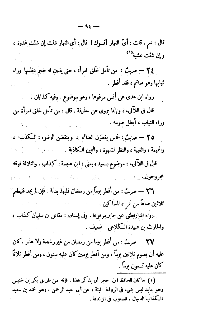 قَالَ: نَعَمْ قُلْتُ: أَيَّ النَّهَارِ أَتَسَوَّكُ؟ قَالَ: أَيَّ النَّهَارِ شِئْتَ إِنْ شِئْتَ غُدْوَةً وَإِنْ شِئْتَ عشيه (1) . 24 - حديث: "مَنْ تَأَمَّلَ خَلْقَ امْرَأَةٍ حَتَّى يَتَبَيَّنَ لَهُ حَجْمُ عَظْمِهَا وَرَاءَ ثِيَابِهَا وَهُوَ صَائِمٌ فَقَدْ أَفْطَرَ".