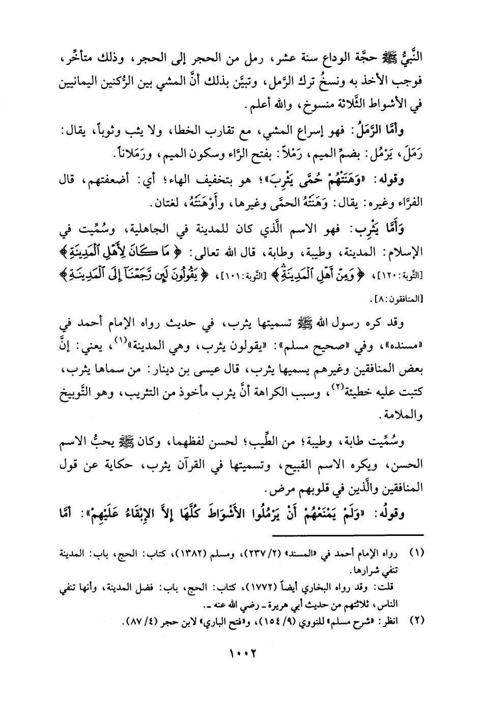 وقد كره رسول الله - صلى الله عليه وسلم - تسميتها يثرب، في حديث رواه الإمام أحمد في "مسنده"، وفي "صحيح مسلم": "يقولون يثرب، وهي المدينة" (¬1)، يعني: إنَّ بعض المنافقين وغيرهم يسميها يثرب، قال عيسى بن دينار: من سماها يثرب، كتبت عليه خطيئة (¬2)، وسبب الكراهة أنَّ يثرب مأخوذ من التثريب، وهو التَّوبيخ والملامة.