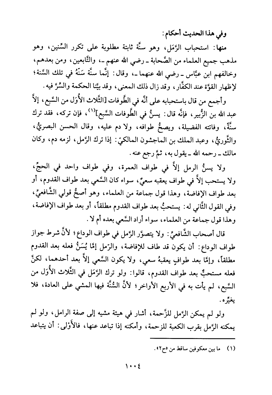 منها: استحباب الرَّمل، وهو سنة ثابتة مطلوبة على تكرر السِّنين، وهو مذهب جميع العلماء من الصحابة -رضي الله عنهم-، والتابعين، ومن بعدهم، وخالفهم ابن عباس - رضي الله عنهما -، وقال: إنما سنَّة سَنّهُ في تلك السَّنة؛ لإظهار القوة عند الكفار، وقد زال ذلك المعنى، وقد بيَّنا الحكمة والسِّرَّ فيه.