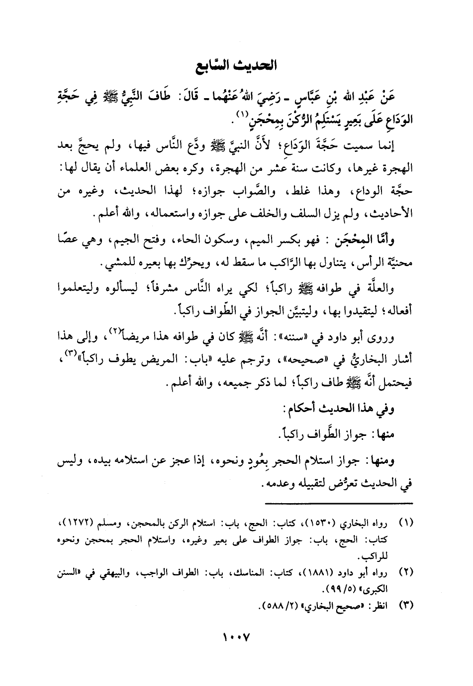 عَنْ عَبْدِ الله بْنِ عَباسٍ -رَضِيَ اللهُ عَنْهُما- قَالَ: طَافَ النبي - صلى الله عليه وسلم - فِي حَجةِ الوَدَاعِ عَلَى بَعِيرٍ يَسْتَلِمُ الركْنَ بِمِحْجَنٍ (¬1).