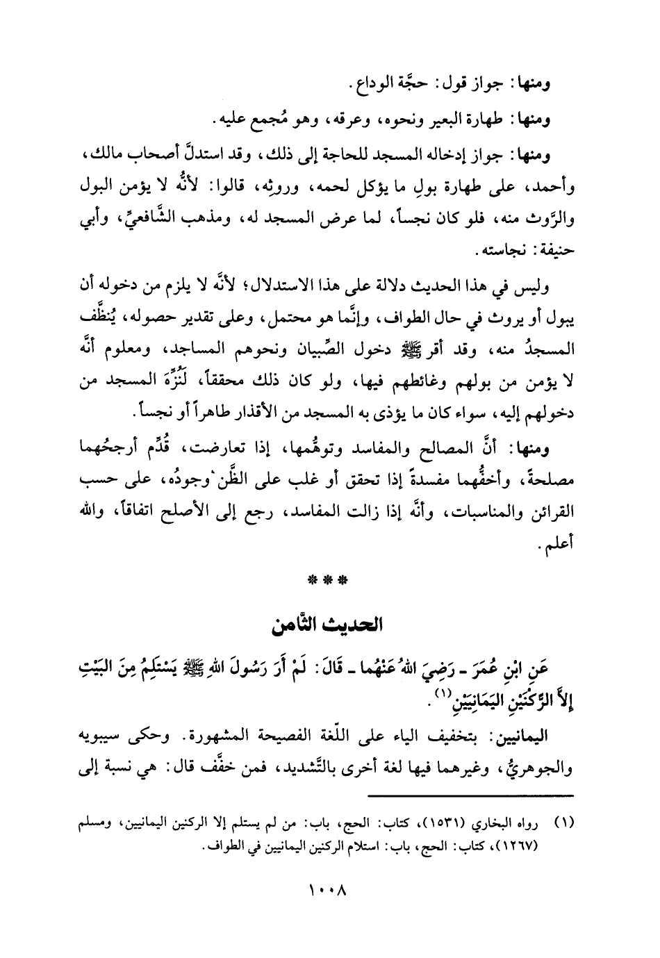 ومنها: جواز إدخاله المسجد للحاجة إلى ذلك، وقد استدل أصحاب مالك، وأحمد، على طهارة بولِ ما يؤكل لحمه، وروثه، قالوا: لأنه لا يؤمن البول والرَّوث منه، فلو كان نجسًا، لما عرض المسجد له، ومذهب الشَّافعي، وأبي حنيفة: نجاسته.