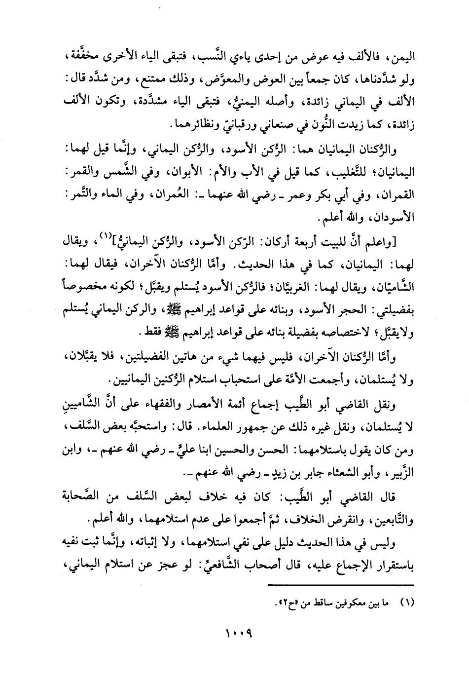 ونقل القاضي أبو الطَّيب إجماع أئمة الأمصار والفقهاء على أن الشاميينِ لا يُستلمان، ونقل غيره ذلك عن جمهور العلماء. قال: واستحبه بعض السلف، ومن كان يقول باستلامهما: الحسن والحسين ابنا عليٍّ -رضي الله عنهم-، وابن الزبير، وأبو الشعثاء جابر بن زيدٍ -رضي الله عنهم-.