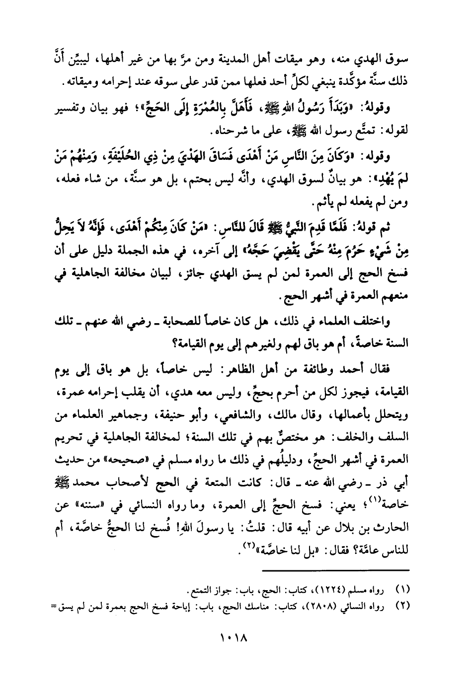 (¬2) رواه النسائي (2808)، كتاب: مناسك الحج، باب: إباحة فسخ الحج بعمرة لمن لم يسق =