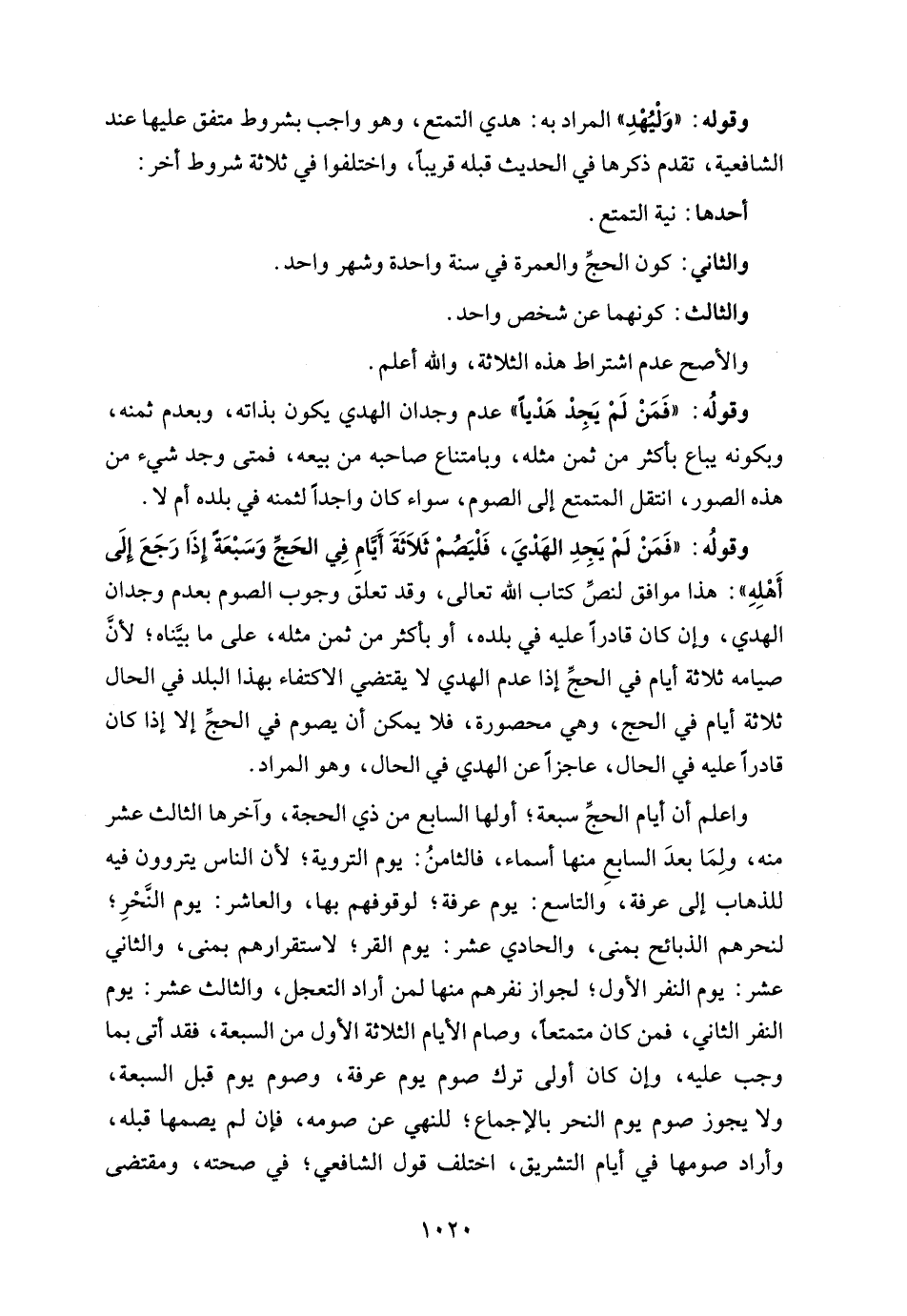 واعلم أن أيام الحجِّ سبعة؛ أولها السابع من ذي الحجة، وآخرها الثالث عشر منه، ولِمَا بعدَ السابعِ منها أسماء، فالثامنُ: يوم التروية؛ لأن الناس يتروون فيه للذهاب إلى عرفة، والتاسع: يوم عرفة؛ لوقوفهم بها، والعاشر: يوم النحْرِ؛ لنحرهم الذبائح بمنى، والحادي عشر: يوم القر؛ لاستقرارهم بمنى، والثاني عشر: يوم النفر الأول؛ لجواز نفرهم منها لمن أراد التعجل، والثالث عشر: يوم النفر الثاني، فمن كان متمتعًا، وصام الأيام الثلاثة الأول من السبعة، فقد أتى بما وجب عليه، وإن كان أولى ترك صوم يوم عرفة، وصوم يوم قبل السبعة، ولا يجوز صوم يوم النحر بالإجماع؛ للنهي عن صومه، فإن لم يصمها قبله، وأراد صومها في أيام التشريق، اختلف قول الشافعي؛ في صحته، ومقتضى